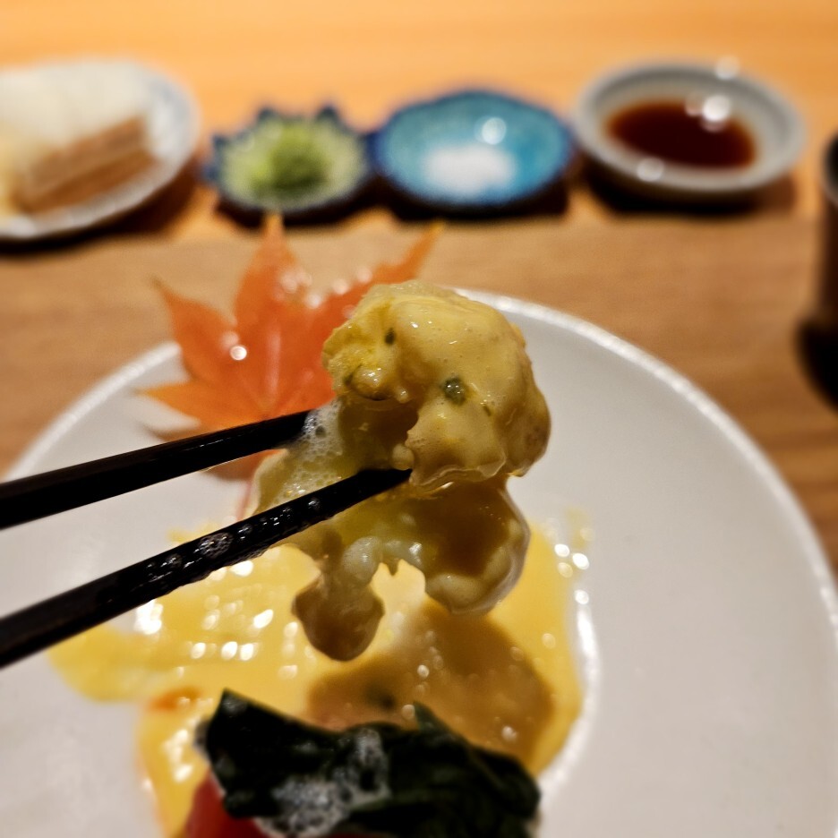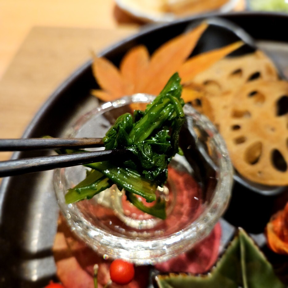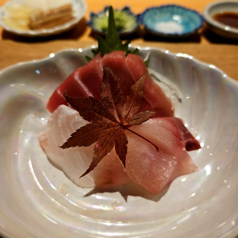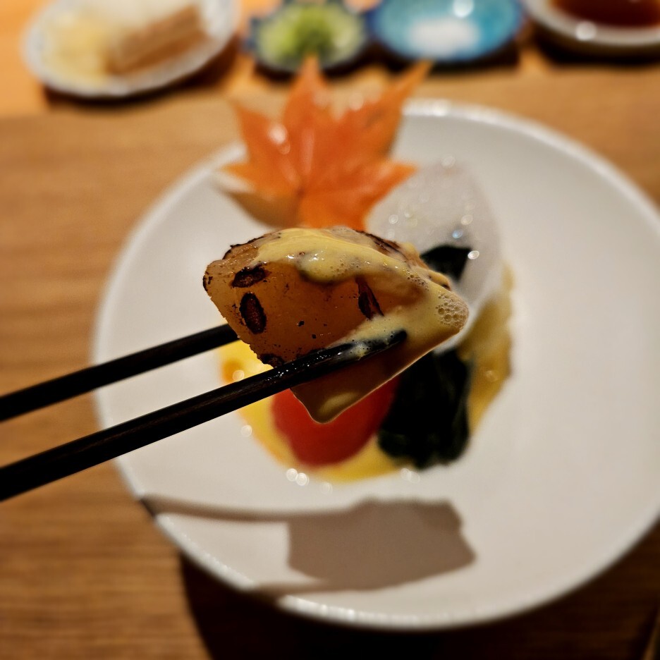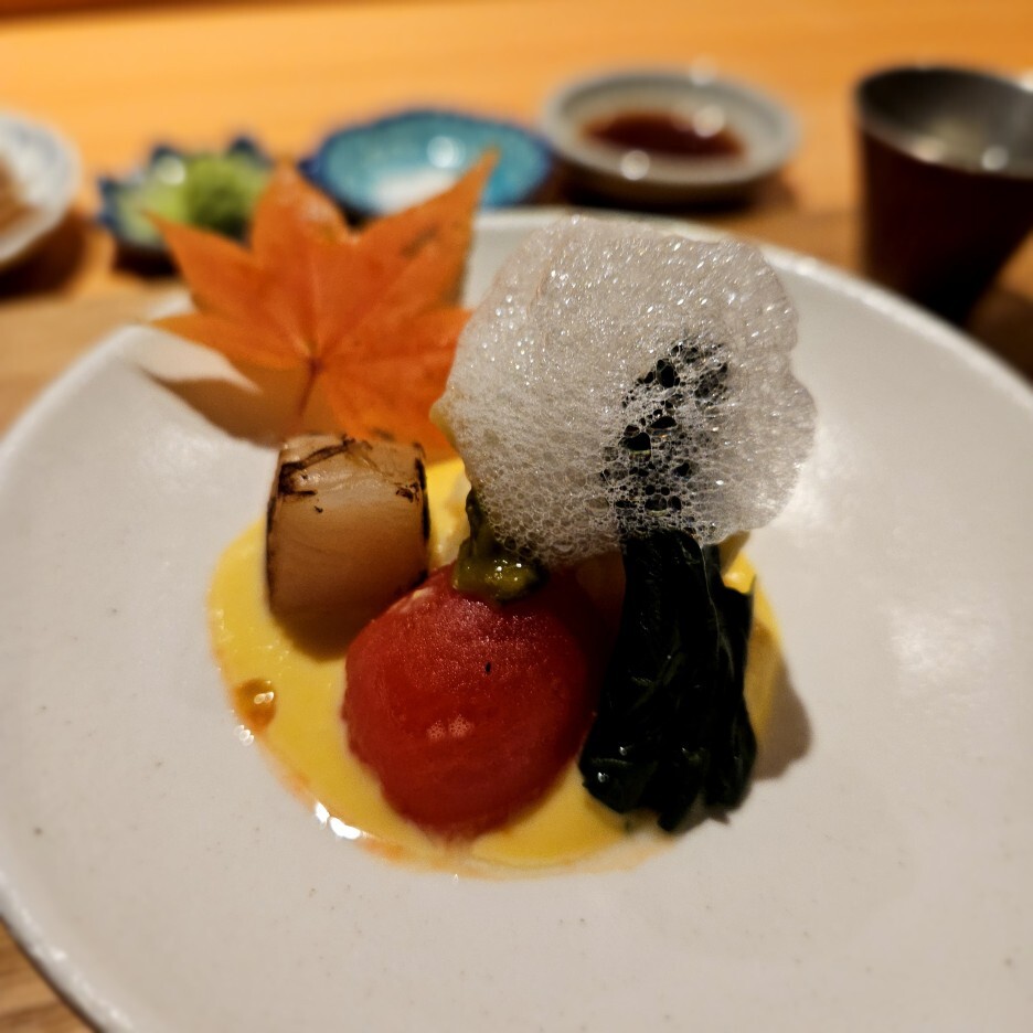 사키츠케(先付け)는 정확하게는 술을 한잔 마시고 처음 나오는 안주를 의미하는 것으로 알고 있으나, 편하게 애피타이저라고 생각하면 될 것 같다. 아주 고급스러운 모양을 가진 녀석이다. 관자와 브로콜리를 상큼한 소스와 함께 나온 것. 직접 수집하셨다는 단풍잎이 더 맛있게 보이게 한다.