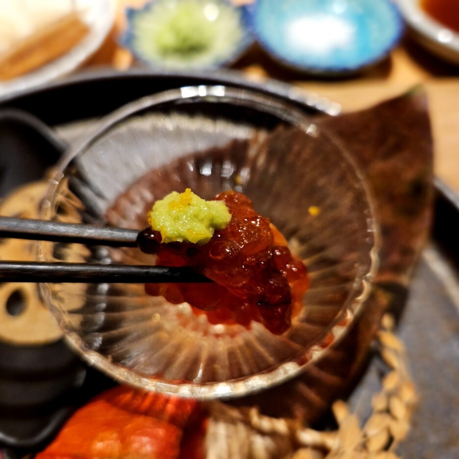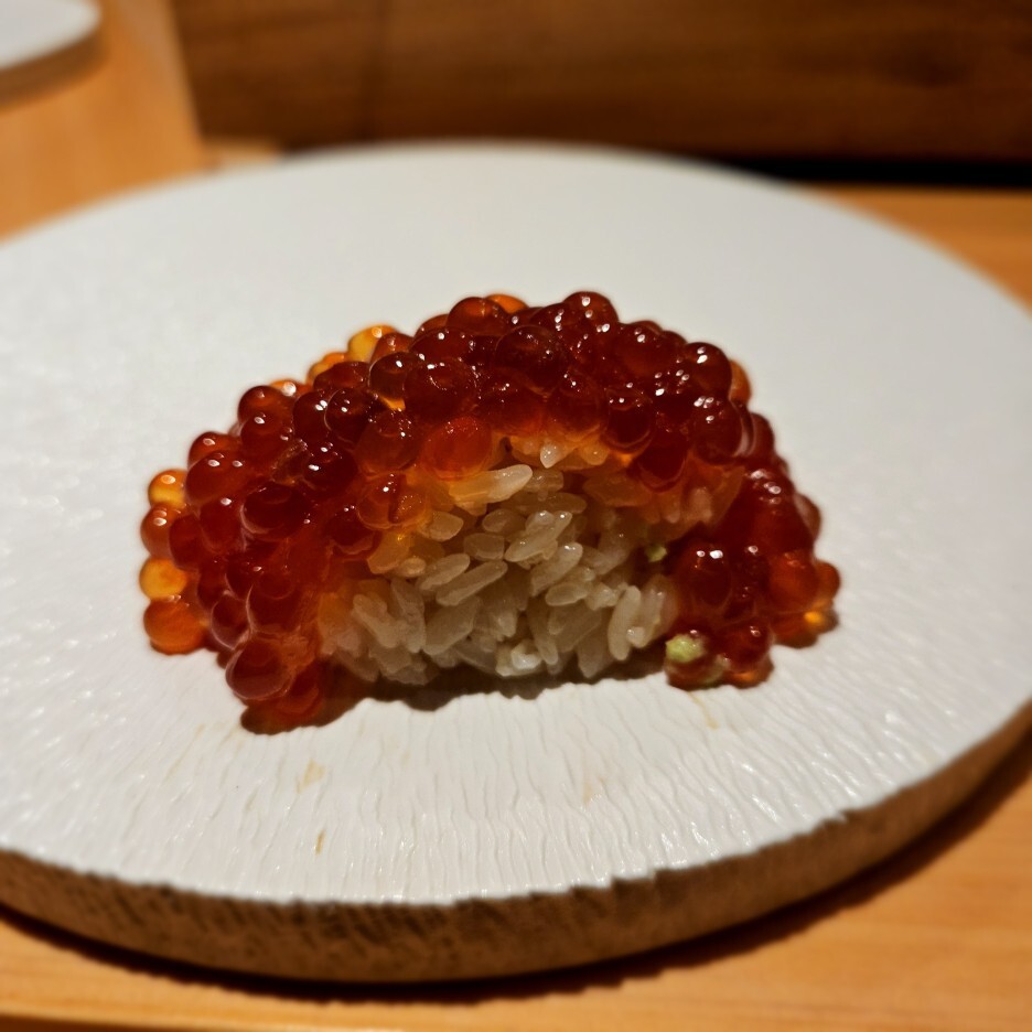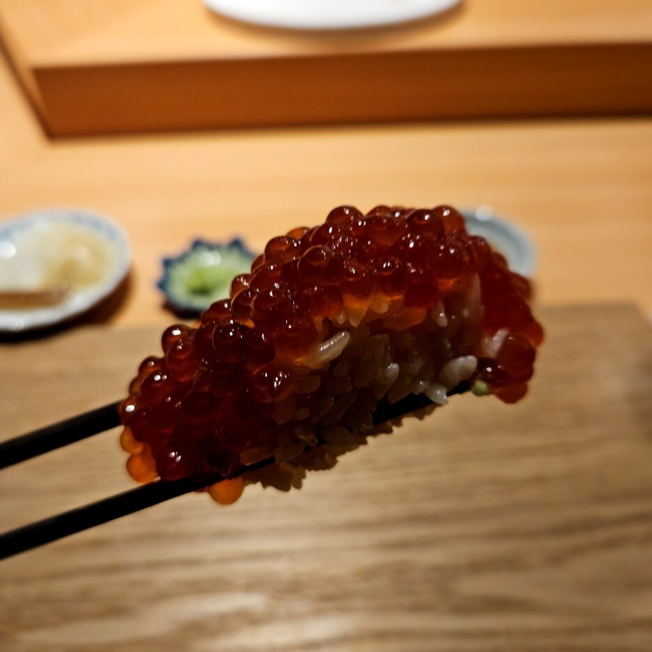 보통 이쿠라로는 이런 니기리 스시로는 모양을 만들기 어려워 김을 감싼 군함류로만 먹을 수 있는데, 시지코는 막에 붙어 있는 알이라, 이렇게 니기리 스시로도 충분히 가능하다. 아무래도 김의 맛이 나지 않는 니기리 스시로 먹으니 연어알의 맛이 더욱 잘 느껴졌다.