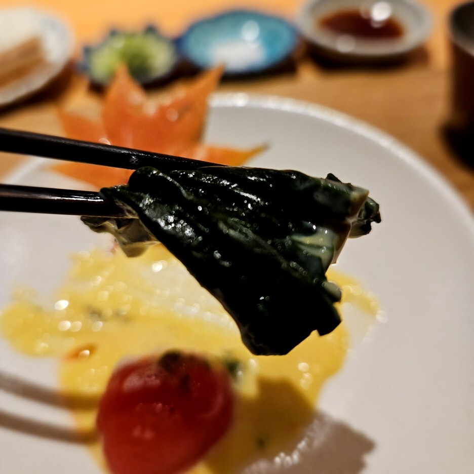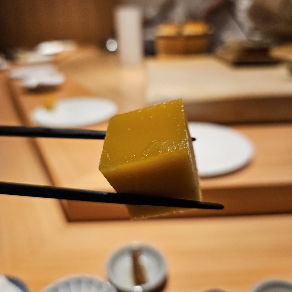 지난번 런치에서 한번 구경을 한, 시지코. 시지코 すじこ 筋子 는 난소막에 들어있는 연결된 상태의 연어알이라고 한다. 시지코는 이쿠라보다는 쉽게 먹을 수 있었다. 그리고 역시 달콤한 맛. 그리고 졸인 밤. 꾸덕한 것이 뭔가 오랜 조리 시간을 거친듯한 독특한 식감이었다.