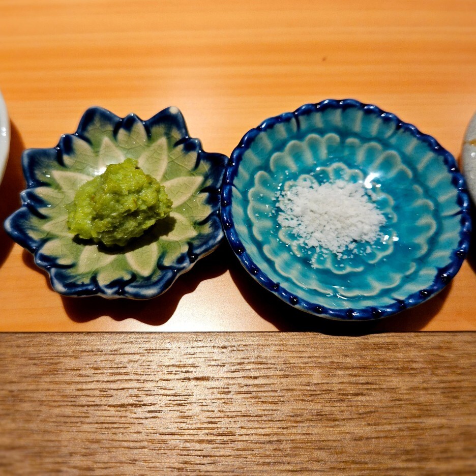 츠케모노와 와사비 소금 간장의 테이블 세팅. 디너라 조금 더 정갈하게 세팅이 되어 있다.