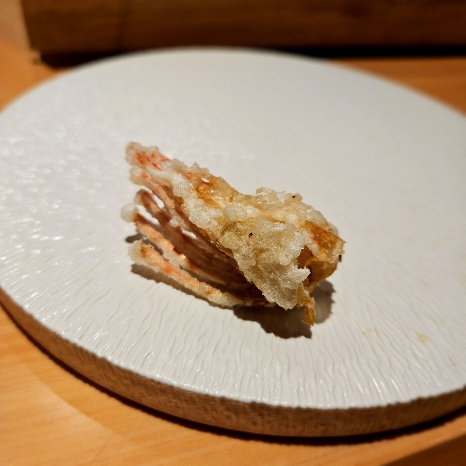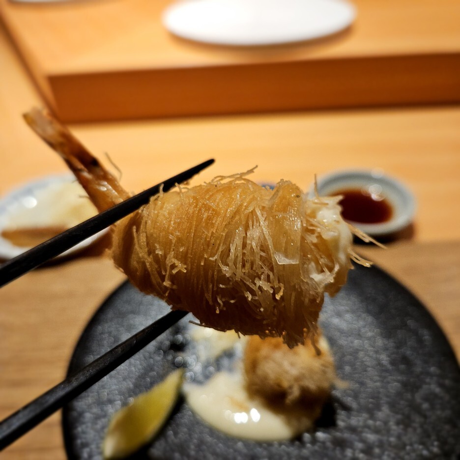 잠깐 쉬어가는 시간. 자연산 대하에 얇은 면 같은 것을 감아 튀겼다. 마요네즈 베이스의 소스와 함께 나왔다.