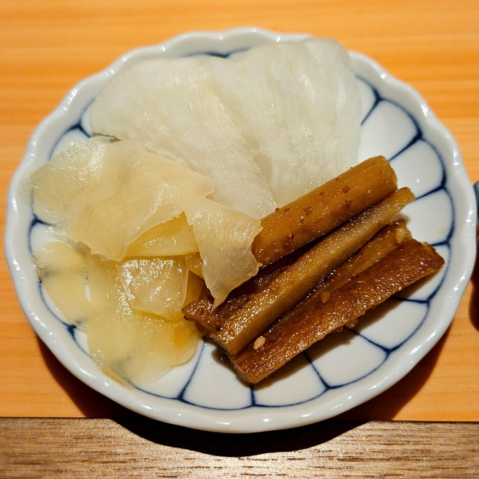 츠케모노는 생강 절임, 우엉조림, 무 조림이 준비되어 있고, 하나같이 다 훌륭한 맛. 가게에서 직접 다 만드시는 것이라고 한다.