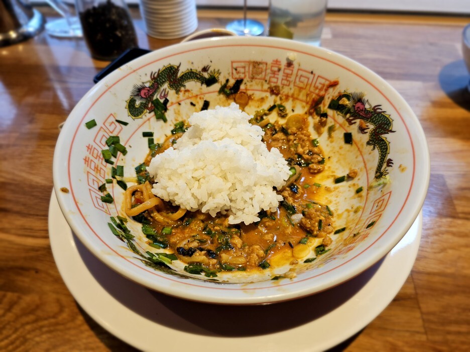 어느 정도 면을 먹고, 마제소바니 밥을 비벼 먹기 위해 밥을 요청해 받았다. 사실 이때까지 밥이 무료인 줄 몰랐다. 라멘을 먹을 때도 밥은 무료라고 하니, 양 많으신 분들은 꼭 밥을 주문하시기 바란다.