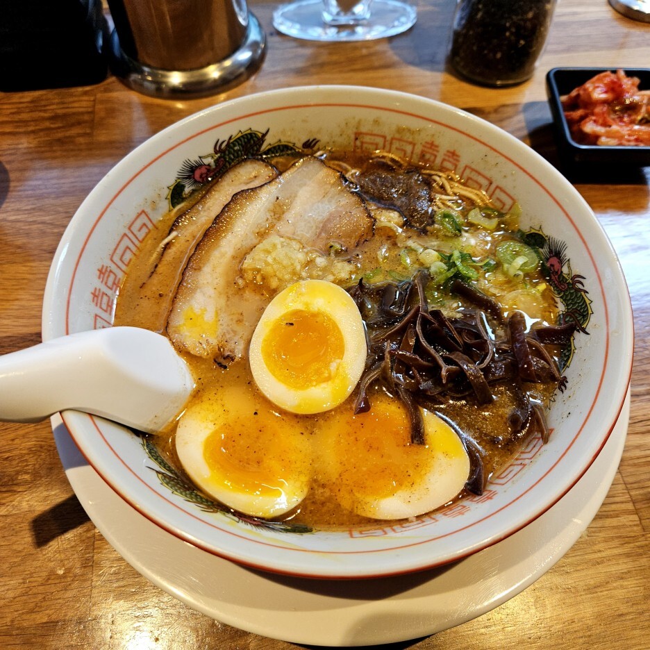 블랙가쓰오라멘은 하얀 돈코츠라멘은 아니었고, 살짝 갈색을 띠며 군데군데 검은색이 보이는 국물의 모습이었다. 기본적으로 간 마늘이 올라가 있는 것도 좋아 보였다.