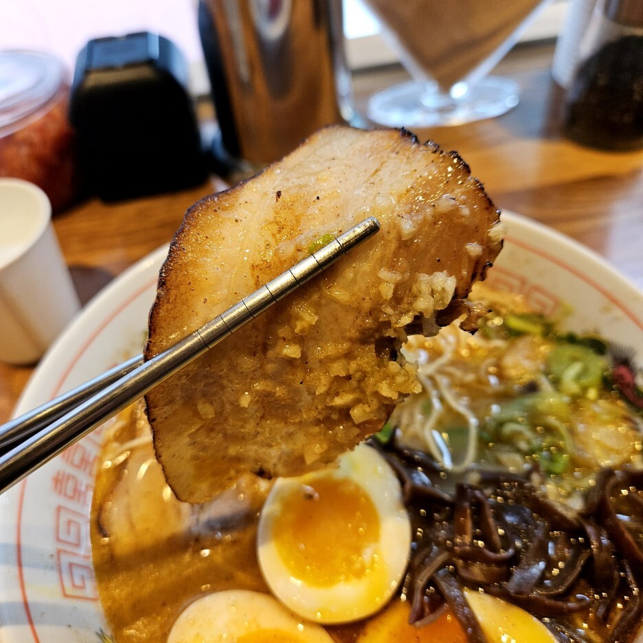돈코츠의 향이 살짝 있지만, 가츠오부시의 맛과 감칠맛이 확 올라온다. 일반 돈코츠는 어떨지 모르겠지만, 블랙가쓰오라멘은 상당히 좋은 느낌이다. 간 마늘의 향도 함께 느껴지니 돈코츠지만 깔끔한 느낌도 들었다.
