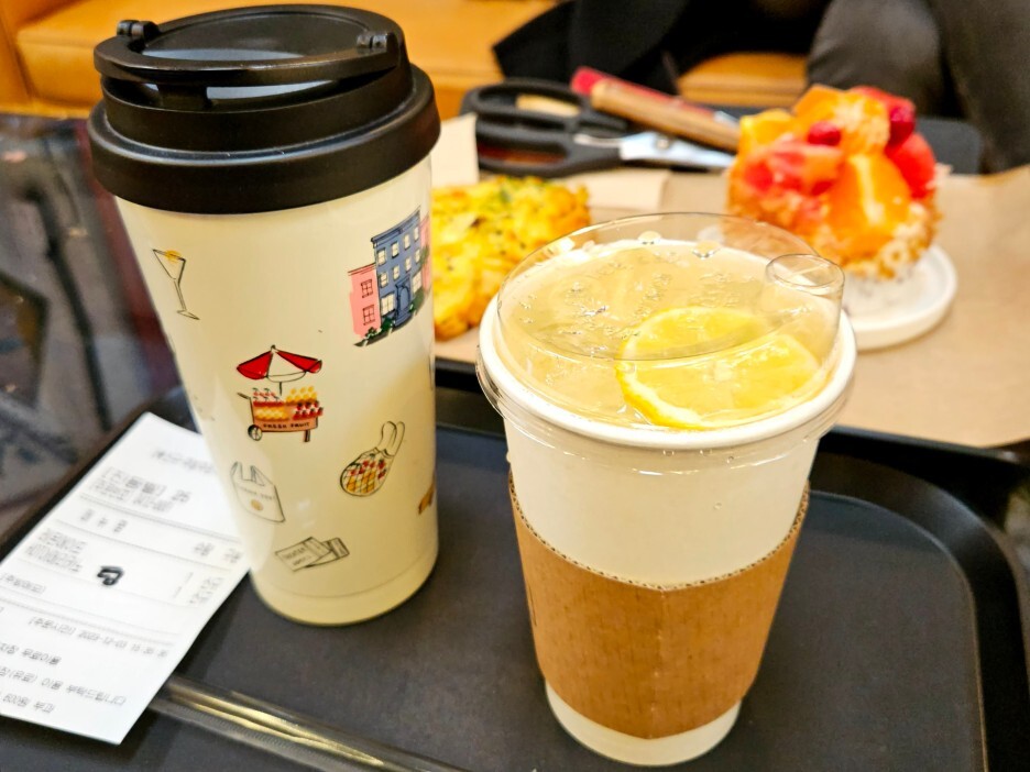 우리는 아메리카노와 레모네이드, 생과일 마들렌, 양파 빵을 구입했다.