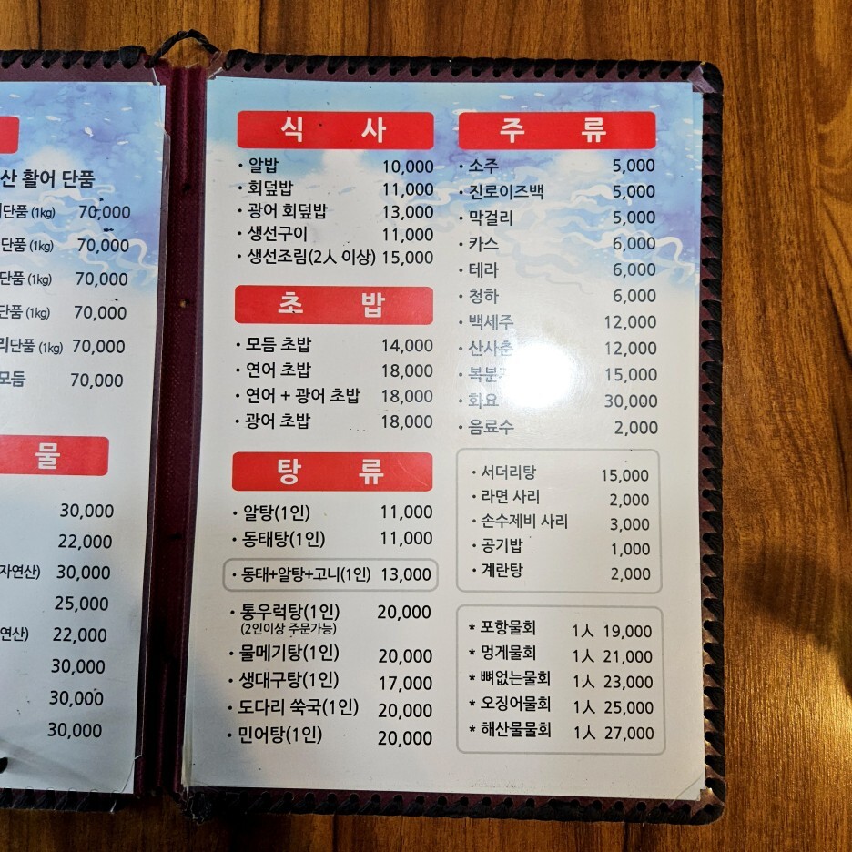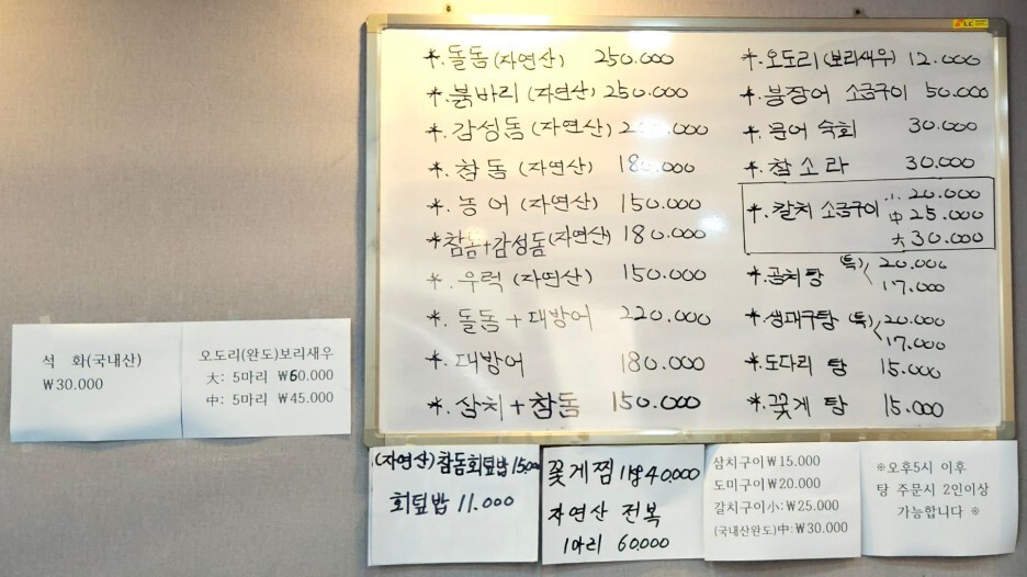 횟감들은 대다수 자연산을 취급하고 있었고, 생선구이와 탕들도 종류가 많다.