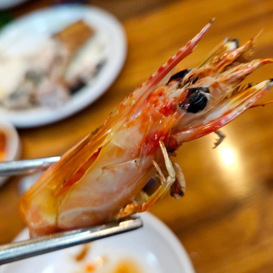 좀 전에 회로 먹은 도화새우의 머리만 모아 잘 구워서 나왔다. 튀긴 것이 더 좋겠지만 구운 것도 고소한 맛이 일품이다. 머리 위에 있는 뿔은 아주 강하므로 떼고 먹는 편이 좋다.