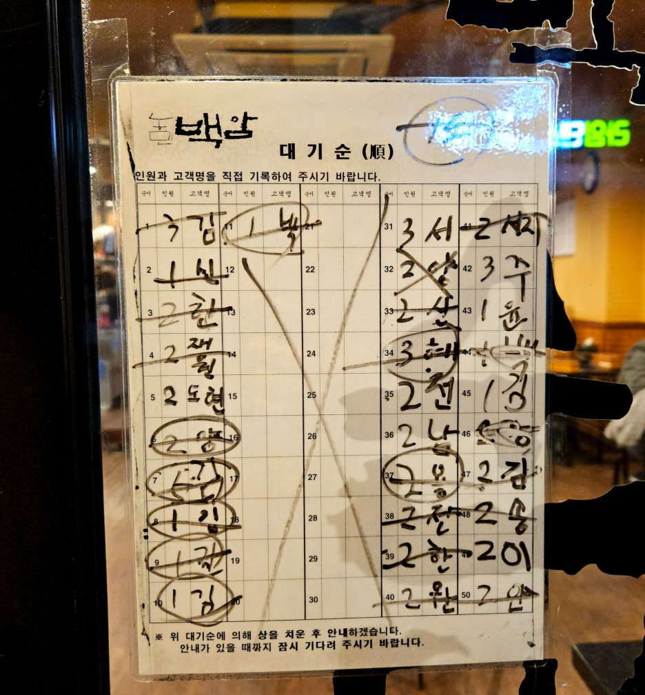 대기 순번표에 사람 수와 성씨를 적어두면 차례대로 안내를 해준다. 이미 벌써 12팀 이상이 대기하고 있는 상태였다.