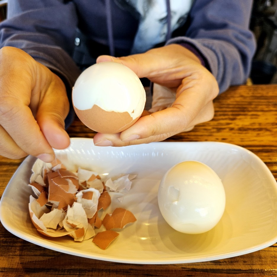 두 번째 할 일. 구입한 삶은 달걀을 경건하게 껍질을 깐다. 삶은 달걀은 비빔국수의 양념과 어주 잘 어울린다.