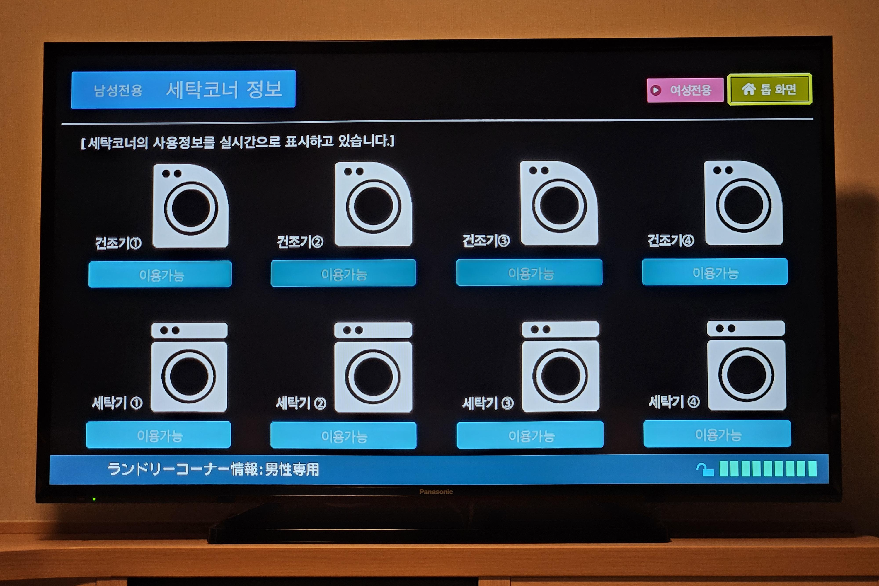 방안에서 TV로 세탁기의 운영 현환을 볼 수 있다. 먼저 지금 세탁을 하러가도 될까라는 궁금할때 세탁기 여유가 있는지 확인 가능하고, 세탁을 돌리고 왔을 경우 남은 시간, 세탁 완료 여부 등을 알 수도 있다.