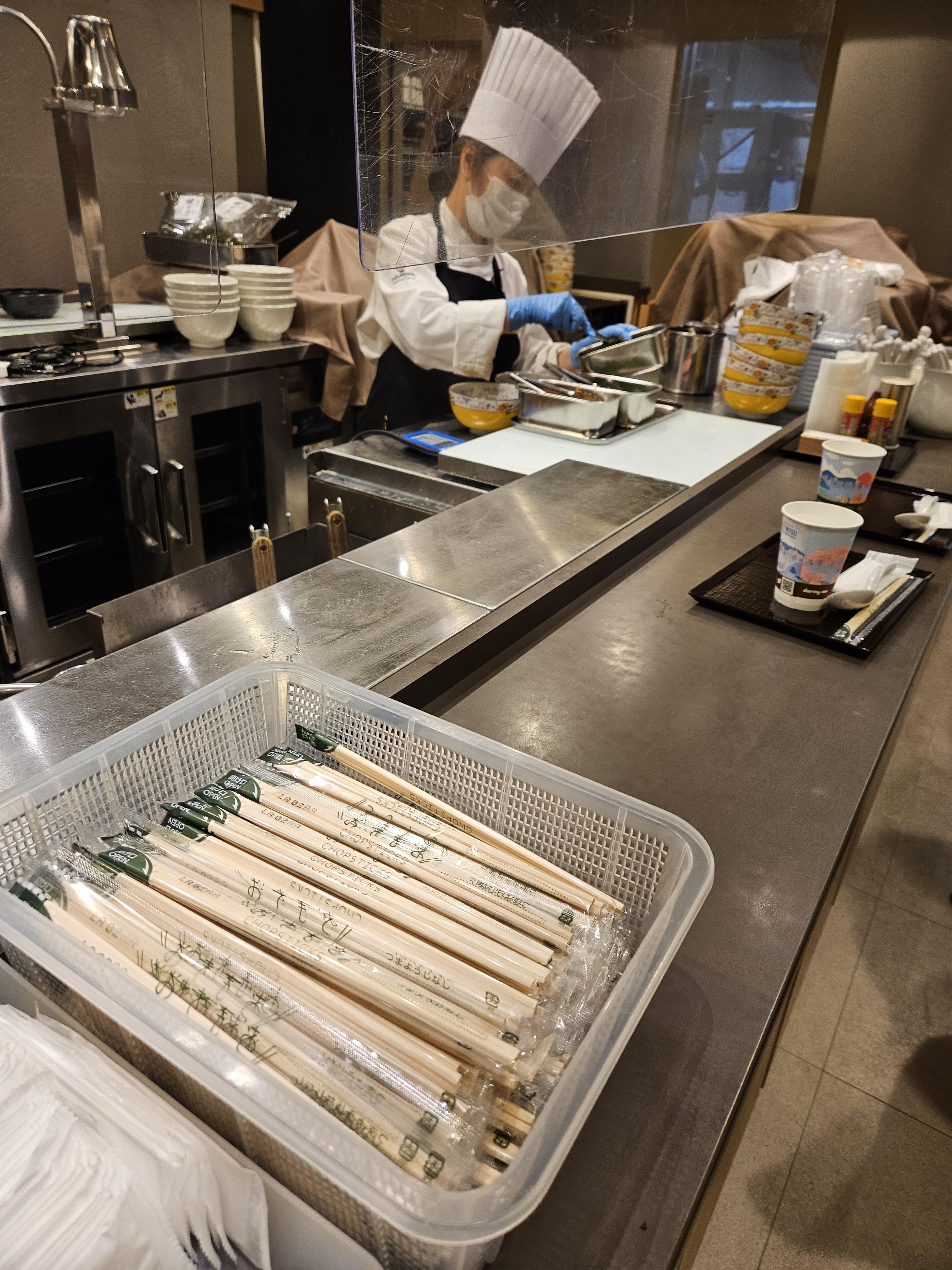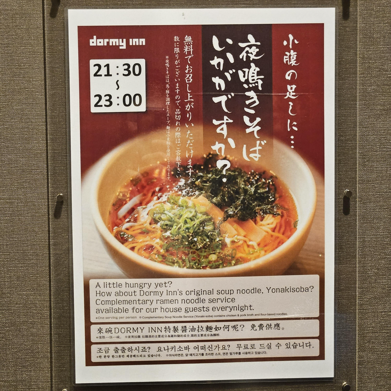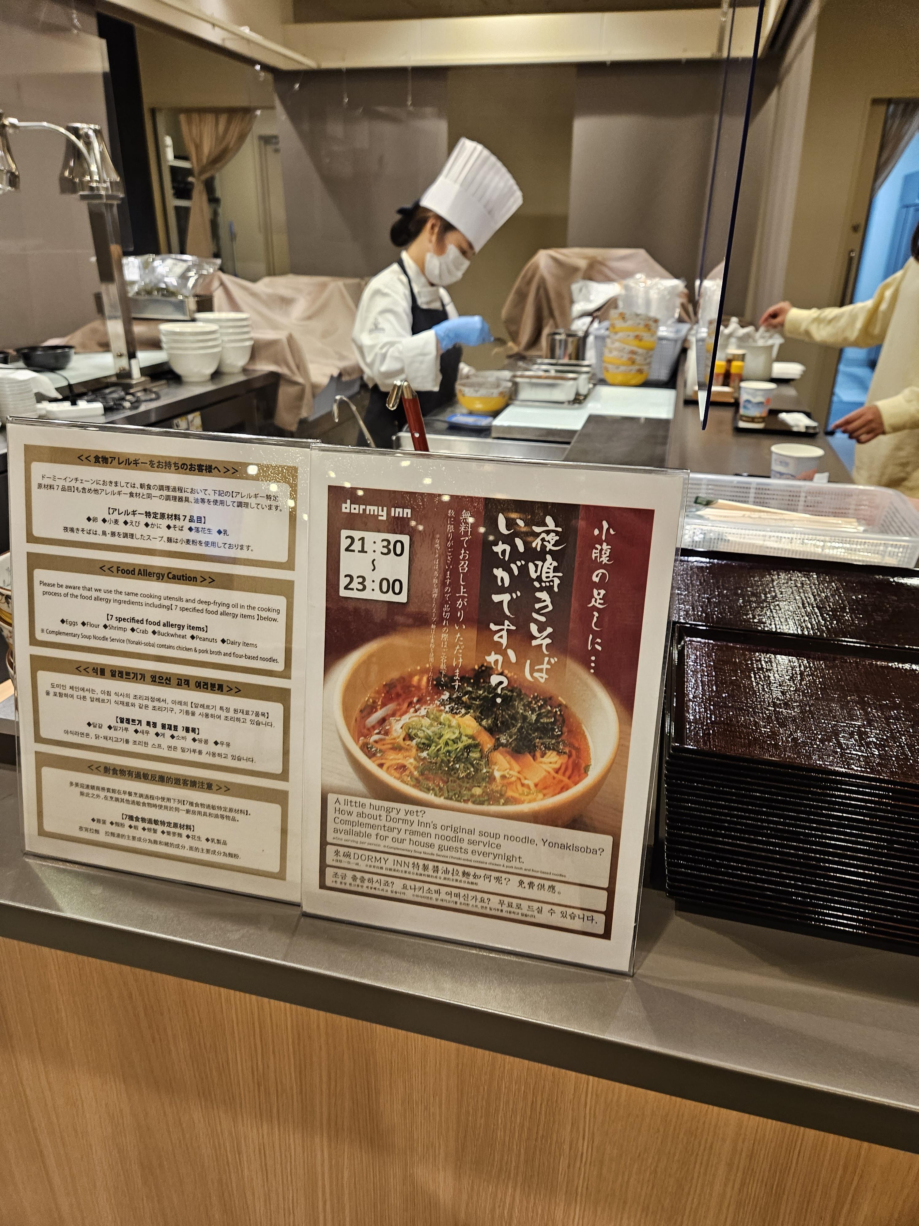 이 야식라멘은 밤 9:30부터 밤 11:00까지 2층의 조식 레스토랑에서 제공한다. 즉석에서 조리를 해주시며 (물론, 뷔페처럼 대다수의 재료들은 미리 준비가 다 되어 있고, 면만 살짝 삶아서 주시는 정도이지만) 시치미(일본식 고춧가루), 후추 등도 준비되어 있다.