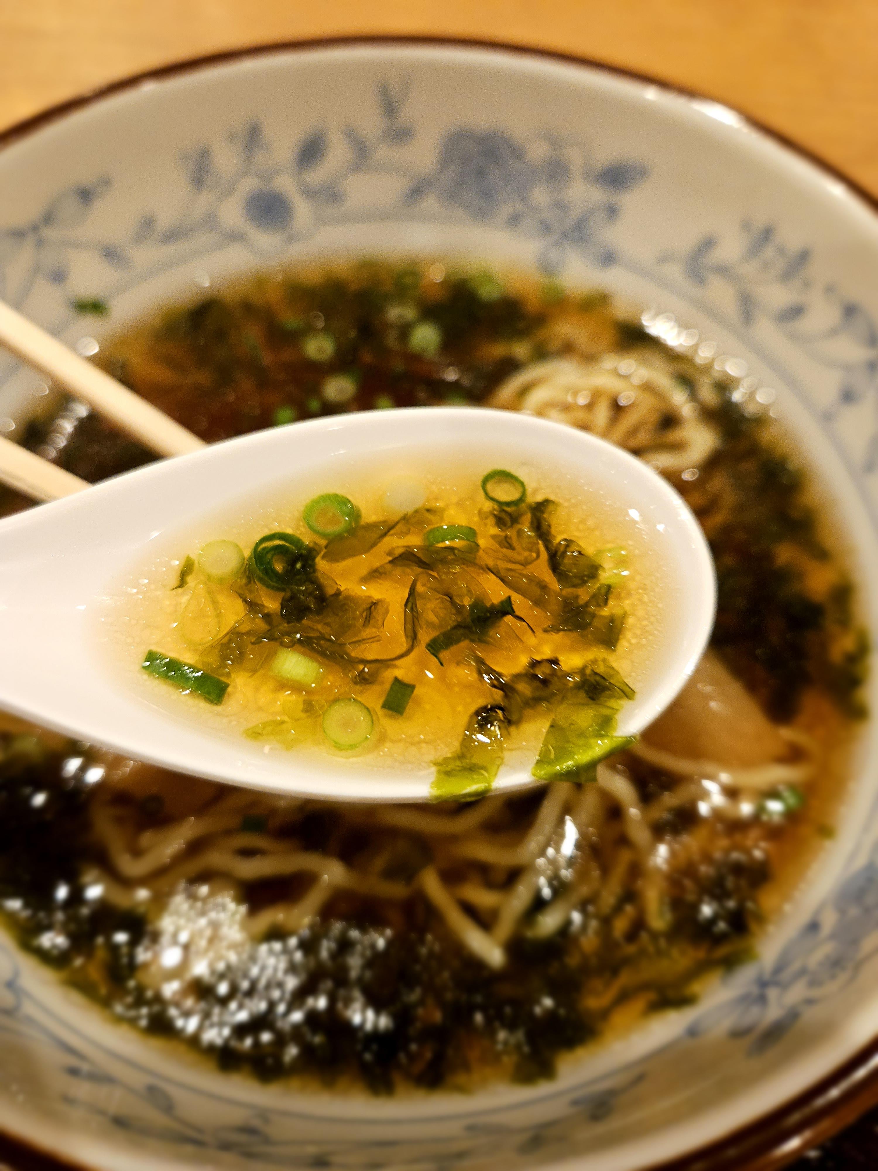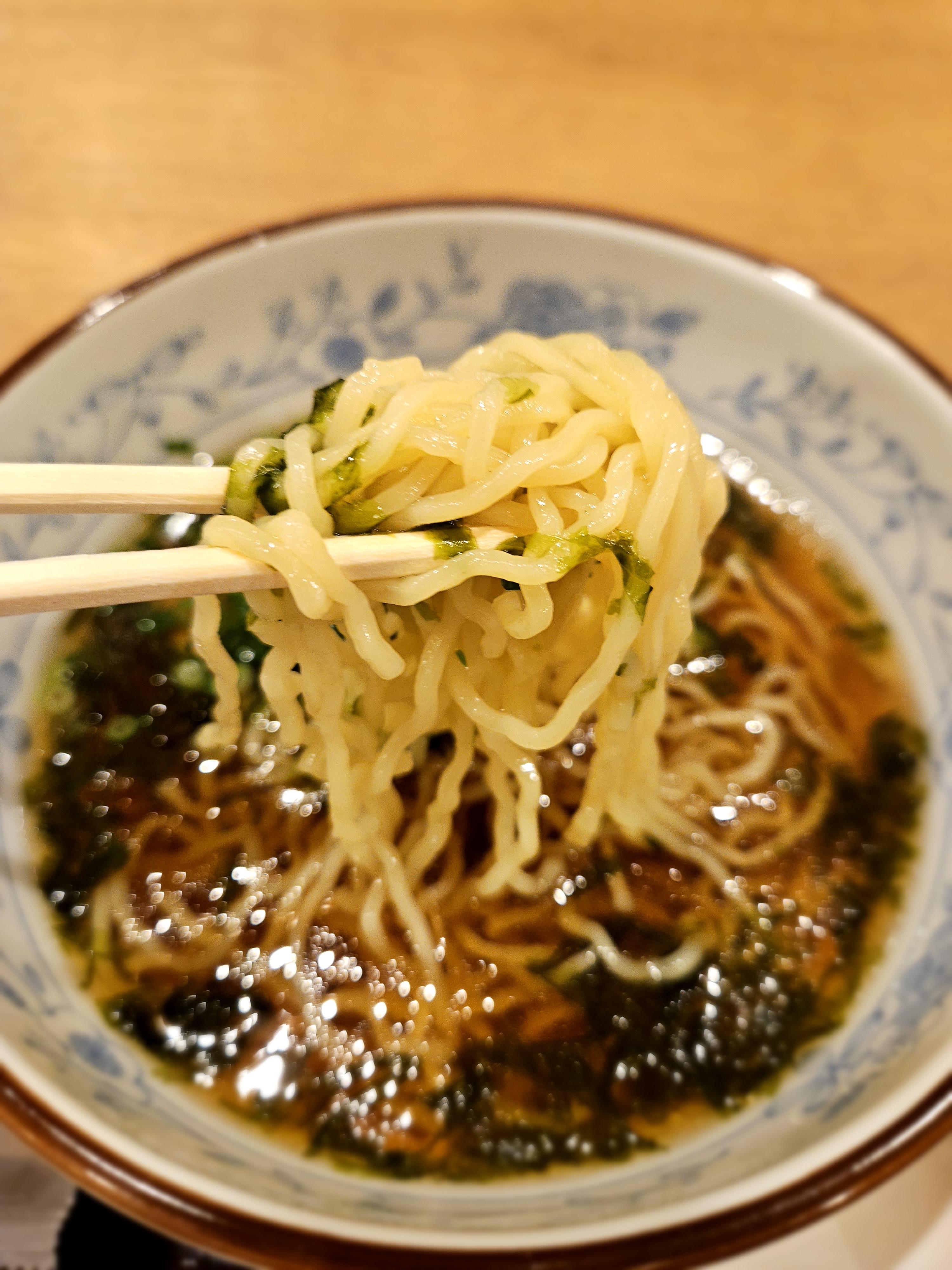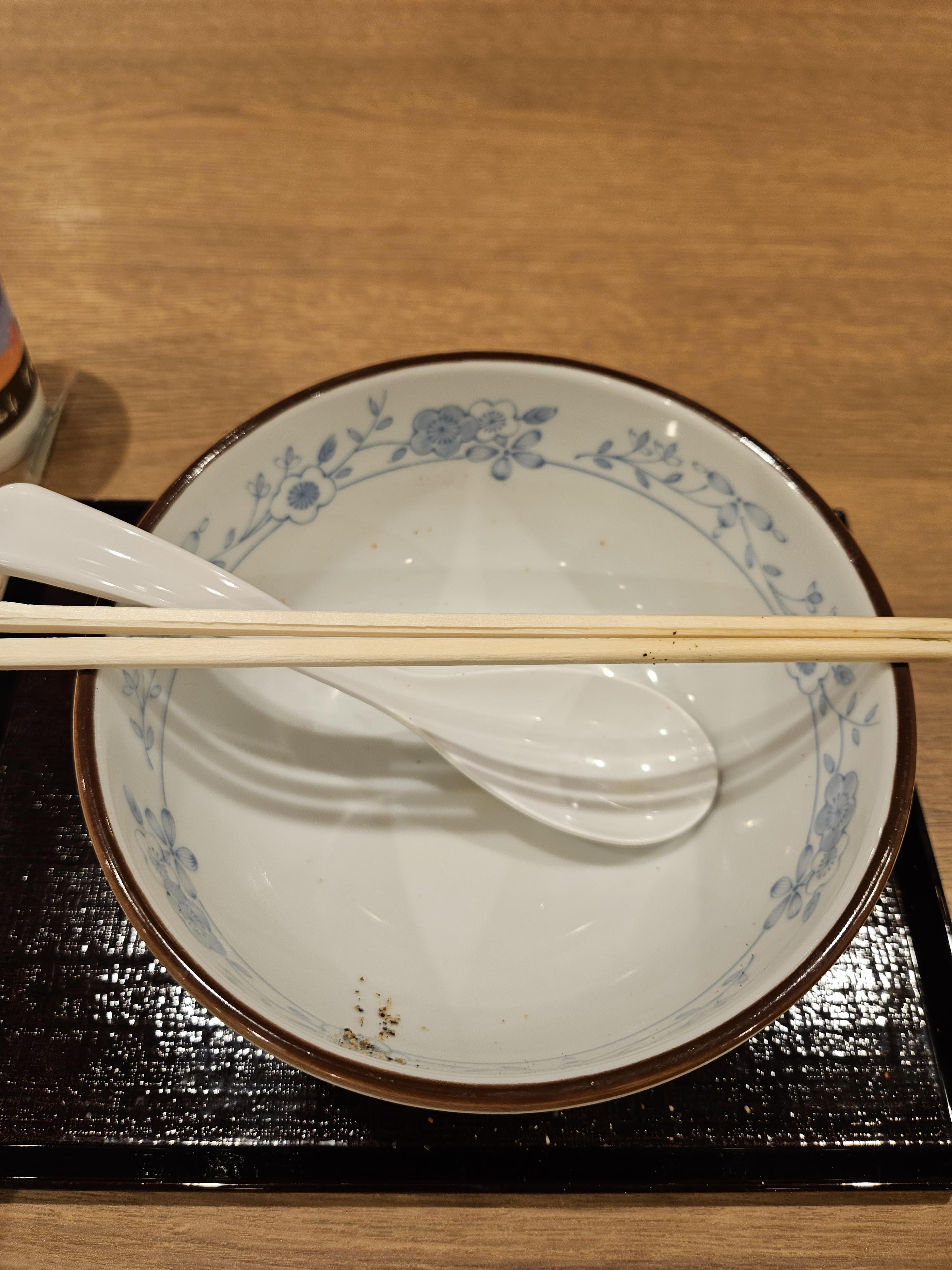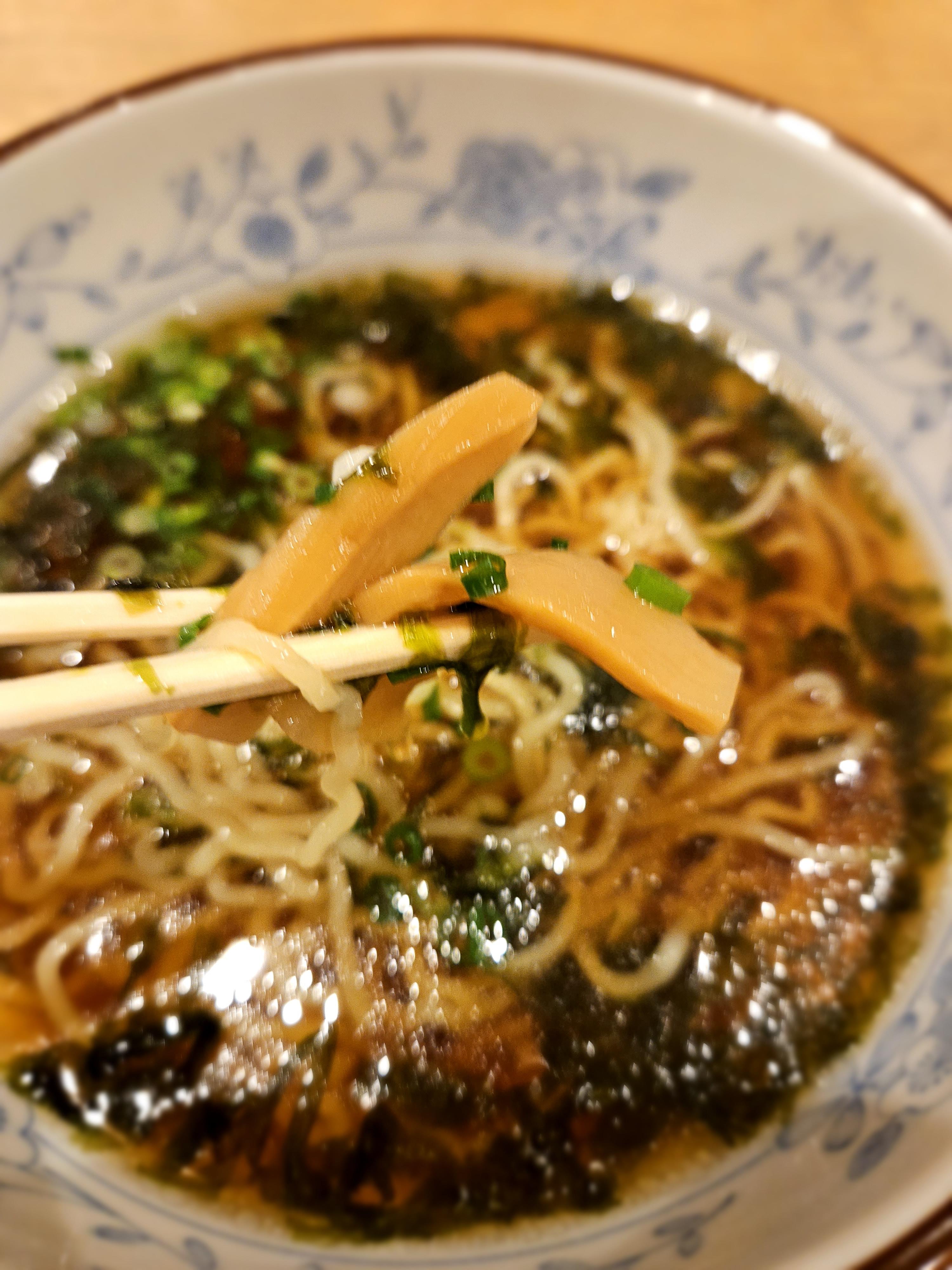 자, 이제 먹어보자. 깔끔한 간장 베이스의 국물이다. 면도 살짝 꼬들한 것이 내 입맛이 딱 맞다. 멘마(데쳐서 발효시킨 죽순)도 들어가 있고, 김과 파도 적절하게 들어가 있어 감칠맛을 돋운다. 물론 양은 그리 많지 않다. 그래서 10분도 안되어서 뚝딱 완! 完!
