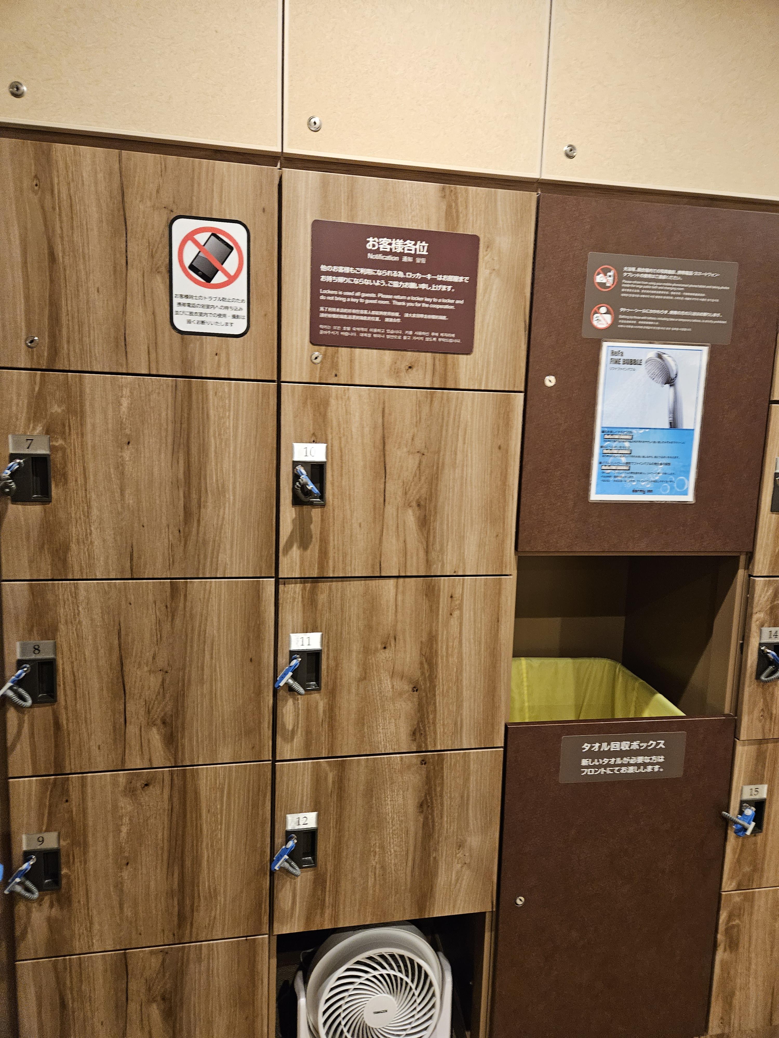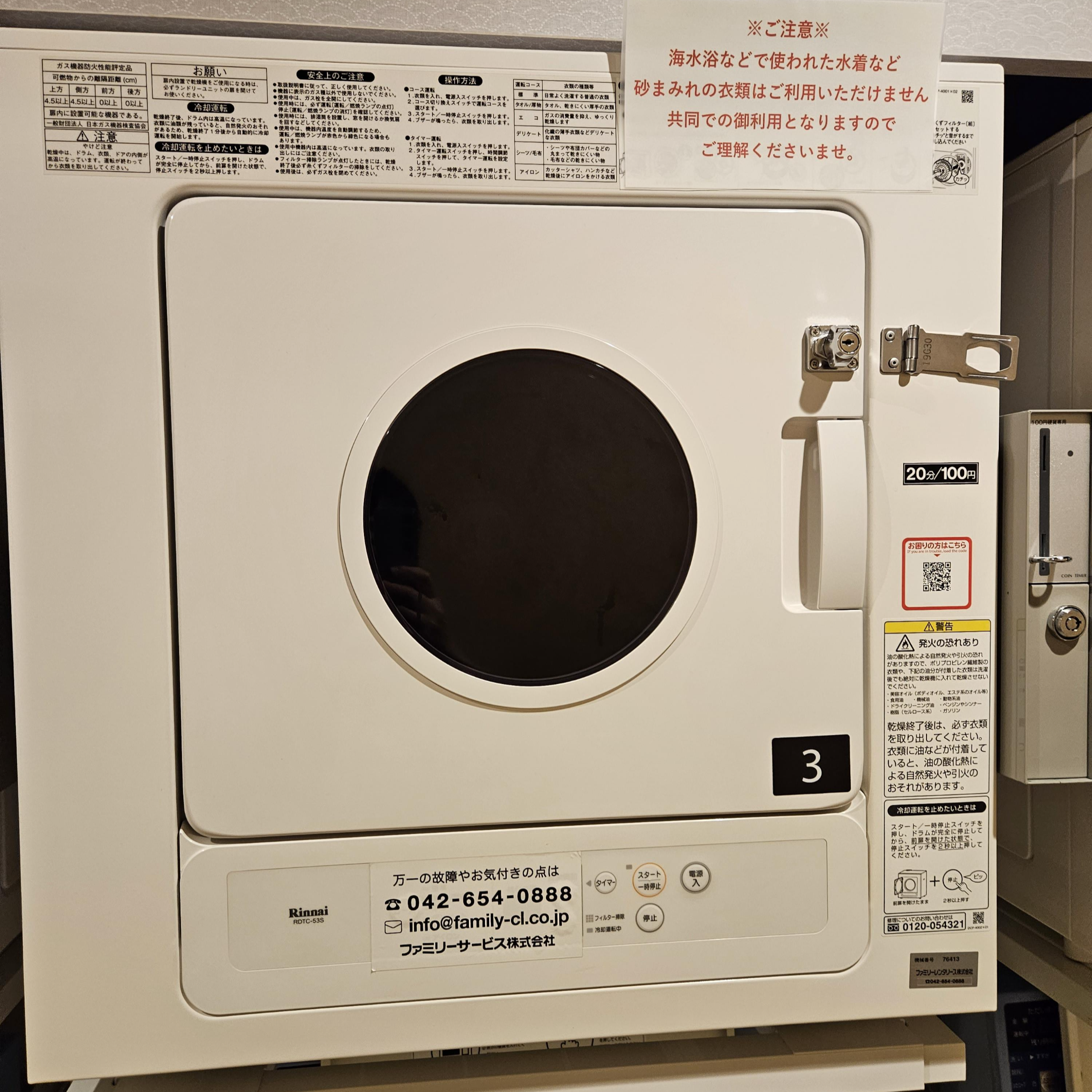 건조기는 유료이다. 100엔이니 그다지 부담은 되지 않는 가격이었다. 100엔에 20분 작동한다. 마찬가지고 자물쇠가 달려있으나 자물쇠 열쇠는 프런트에서 받아와야 한다.