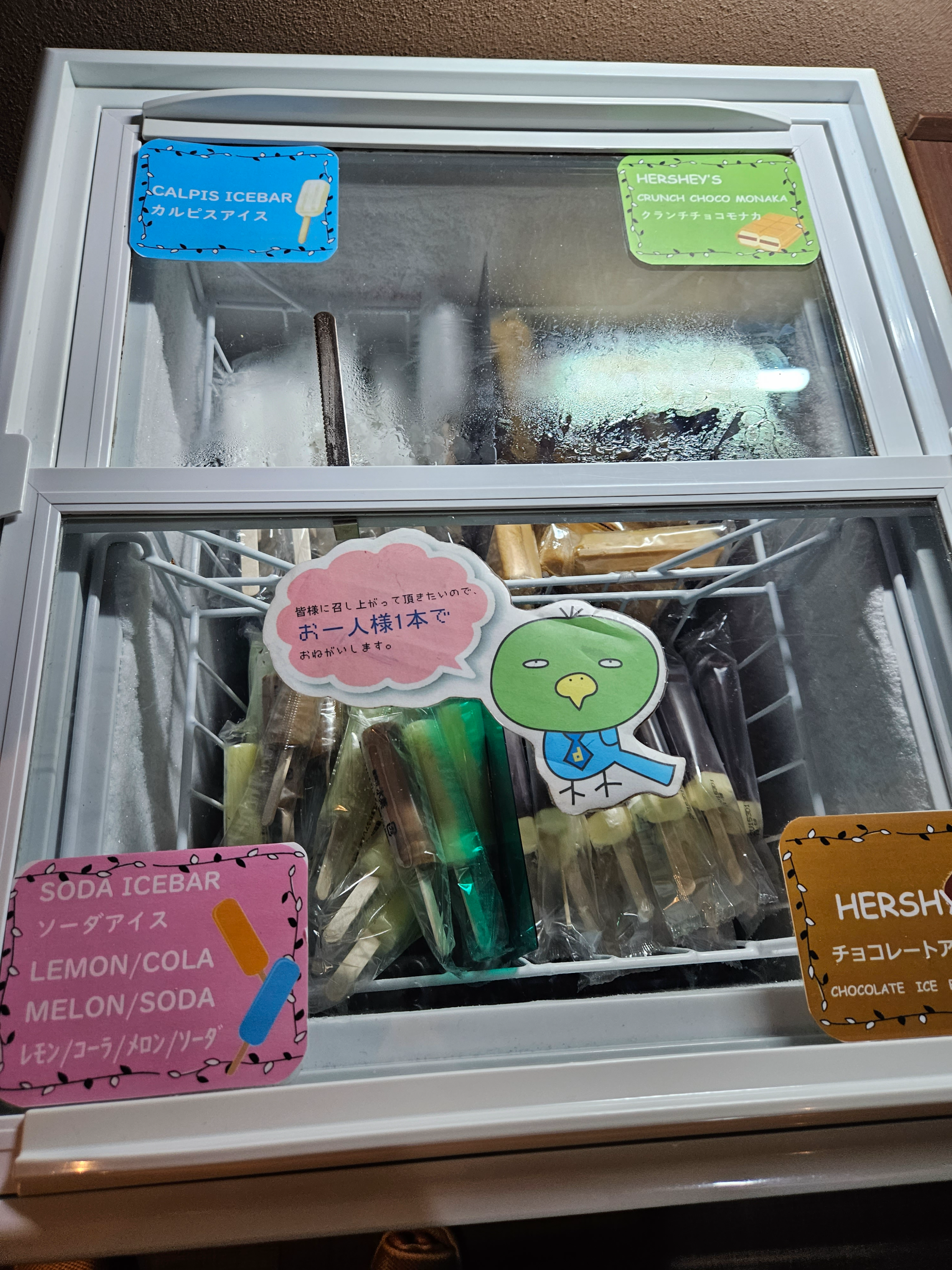 아이스크림은 오후 3:00부터 새벽 1:00까지 먹을 수 있다. 앞서 보여드린 대욕장 온천이 있는 11층에 다양한 만화책과 안마의자 등이 있는 휴게공간 안에 냉동고가 있다. 거기서 직접 꺼내 먹으면 된다. 다른 분들을 위해 1인 1개 먹는 것으로 부탁한다고 적혀 있긴 하지만, 사실 관리를 하는 사람은 없기 때문에 본인의 양심에 따라 먹는 개수를 정하면 된다.