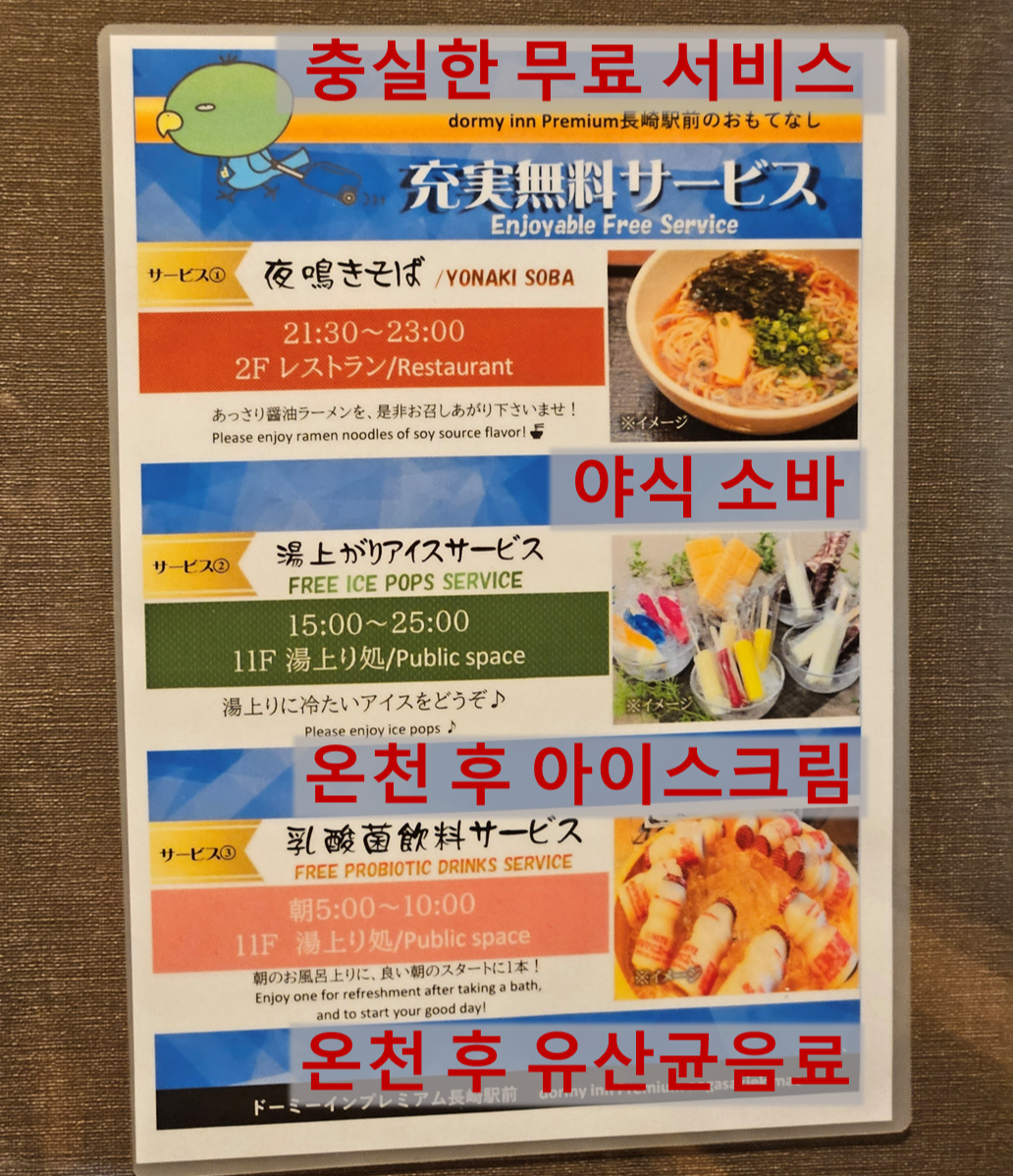 무료 온천, 무료 야식 라멘 등