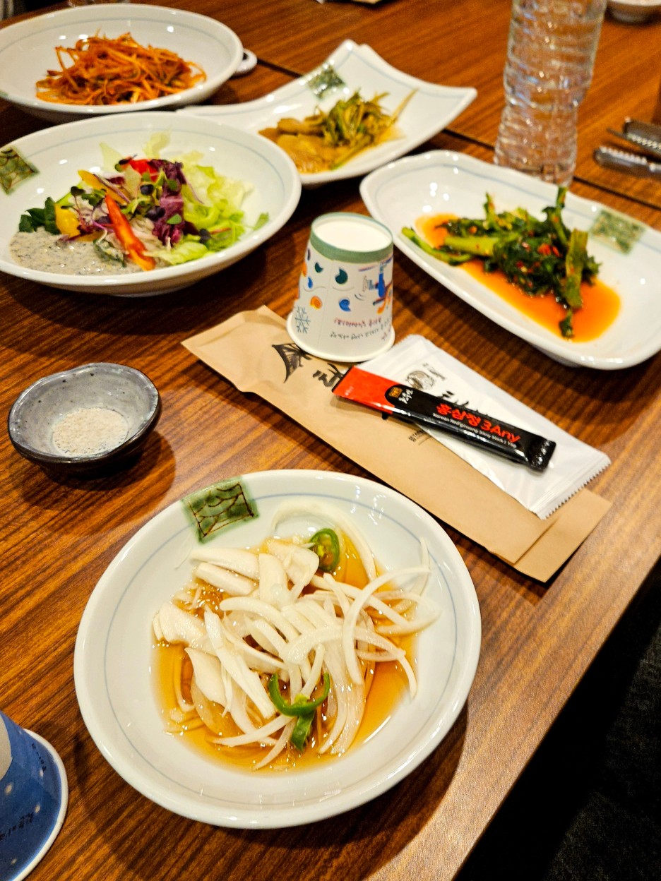 한쪽에는 셀프 바 형태로, 채소와 각종 밑반찬을 가져다 먹을 수 있었다. 우리에게 가장 인기가 많았던 것은 바로 청포묵.