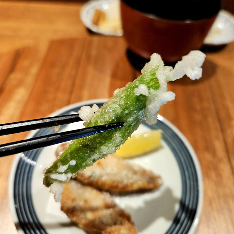 가라아게 형태로 튀겨진 까치복은 쫄깃하면서도 부드럽다. 함께 나온 꽈리고추는 맵지 않고 바삭바삭.