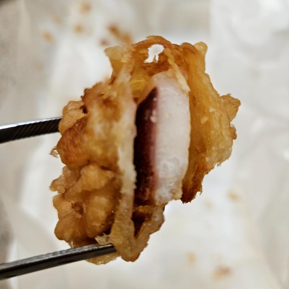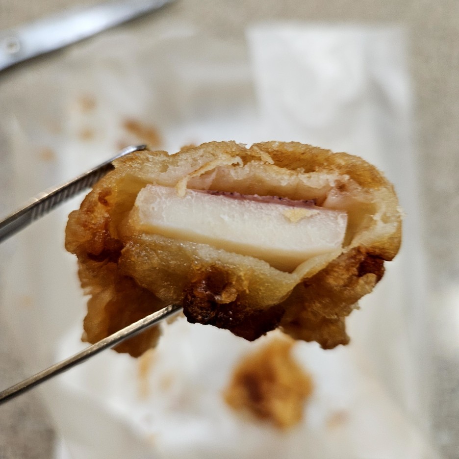 자, 아래의 사진을 보면 오징어튀김의 속살이 네모 반듯한 막대 기둥의 모습이다.