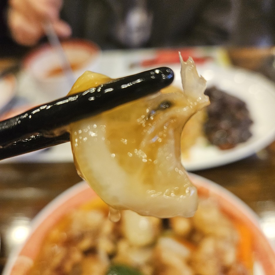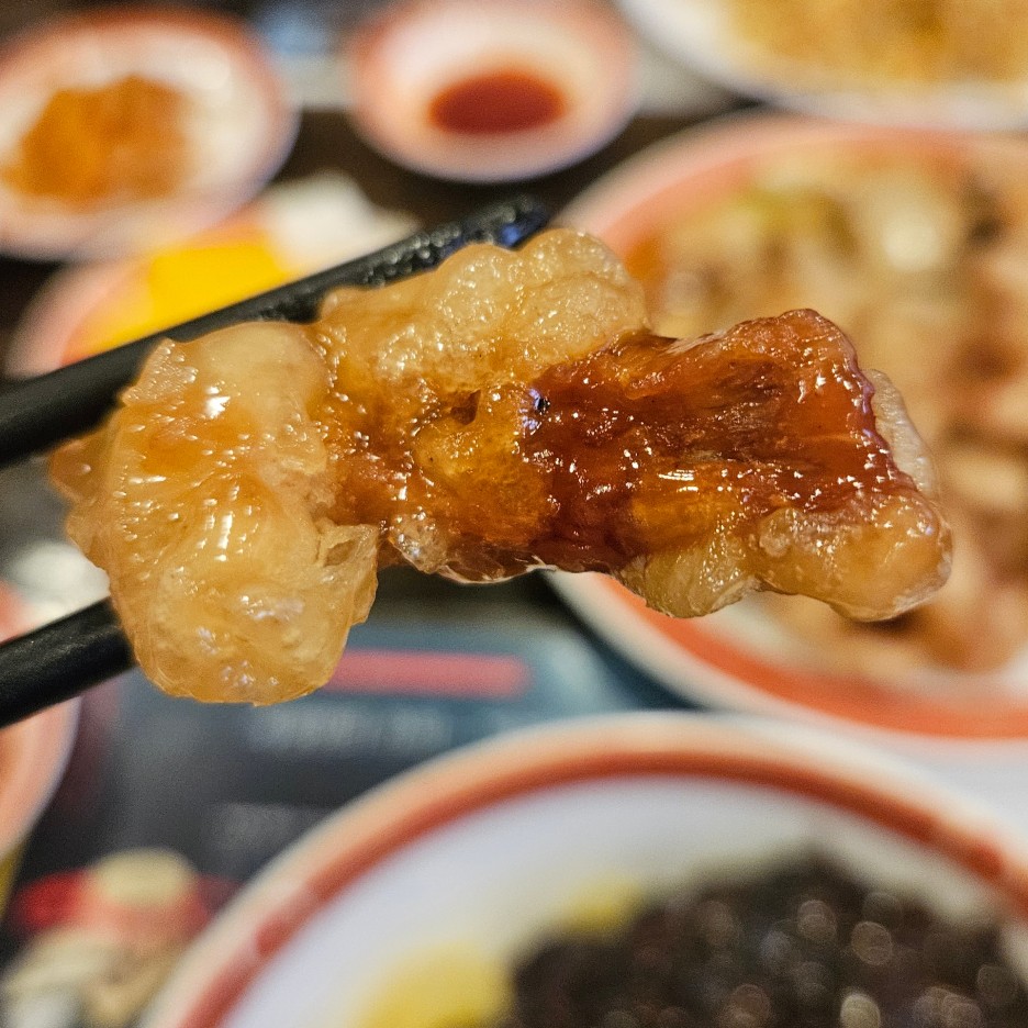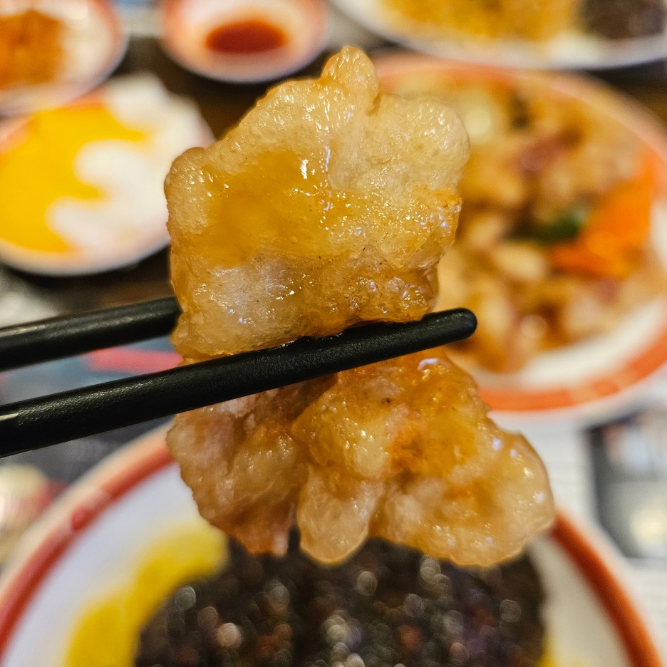 튀김옷에 코팅이 된 소스는 달달함이 느껴지는 모습이다. 튀김옷은 완전 바삭한 느낌이라기보다는 쫄깃한 느낌이지만 눅눅하다는 느낌은 전혀 들지 않는다. 이 느낌은 탕수육을 다 먹을 때까지 꽤 오랜 시간 동안 잘 유지가 되었다. 눅눅해지지 않았다.