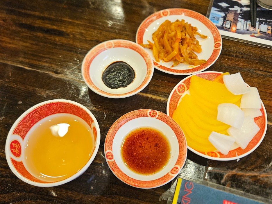 재스민 차, 단무지와 양파, 춘장, 짜샤이. 짜샤이는 별로다. 짜다.
