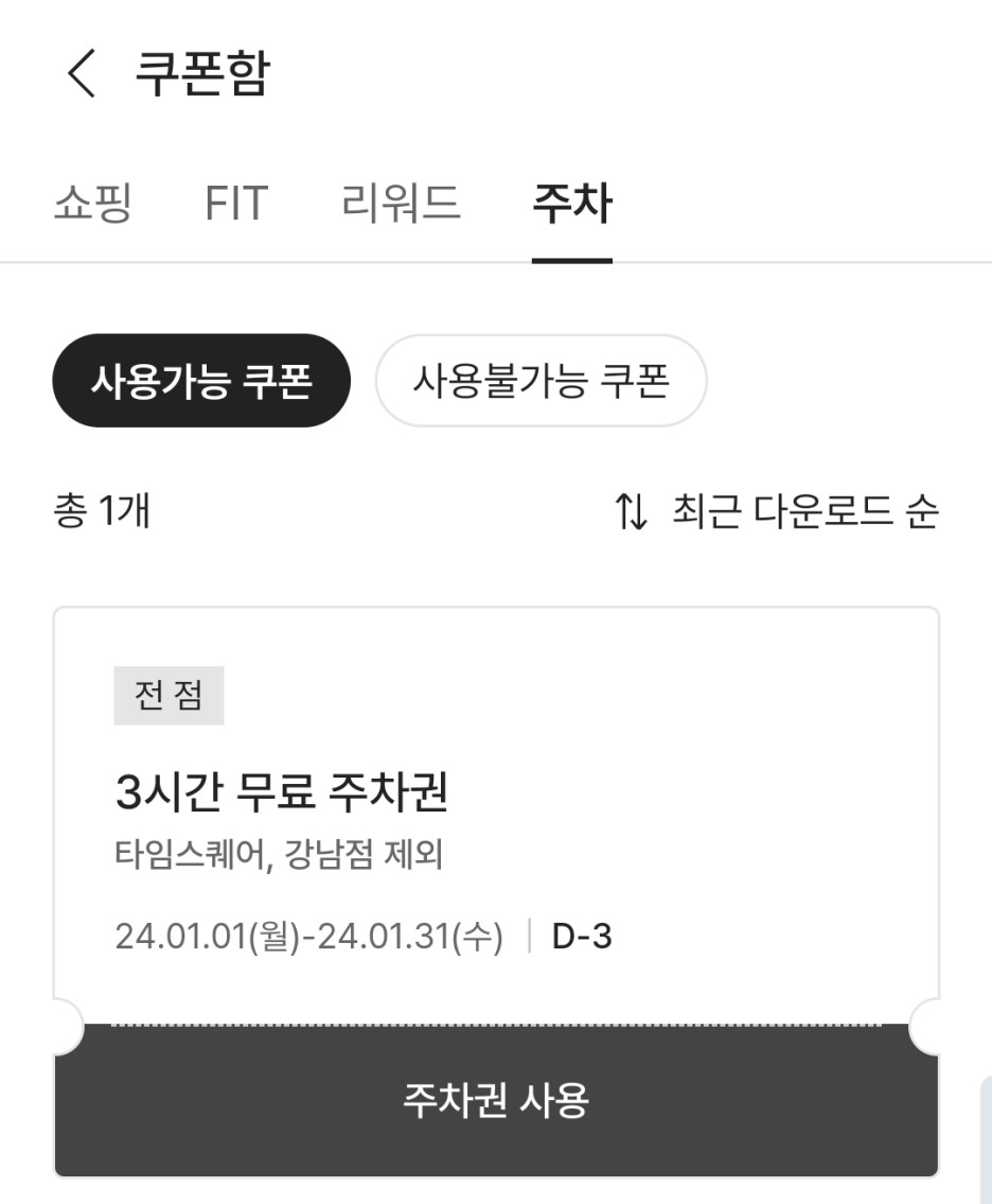 신세계 백화점 앱을 이용하면 매달 2장의 주차권이 지급되며 한번 사용 시 3시간을 무료로 주차할 수 있기 때문.