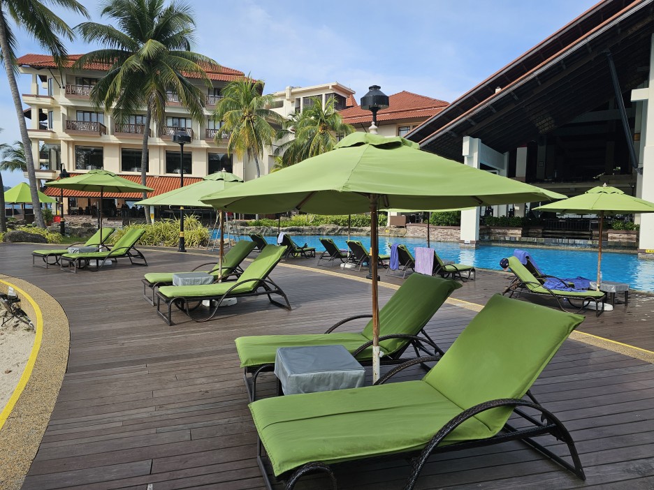 수영장 주변으로는 파라솔과 선베드가 꽤 많은 수가 준비되어 있었다. 아침과 낮에는 그늘이 잘 들지 않는 곳이라 자리 선정을 빨리 잘해야 했다. 정면에서 오른쪽에 있는 선베드들은 그늘이 계속 있었기에 그쪽을 빨리 선점하는 것이 좋았다.