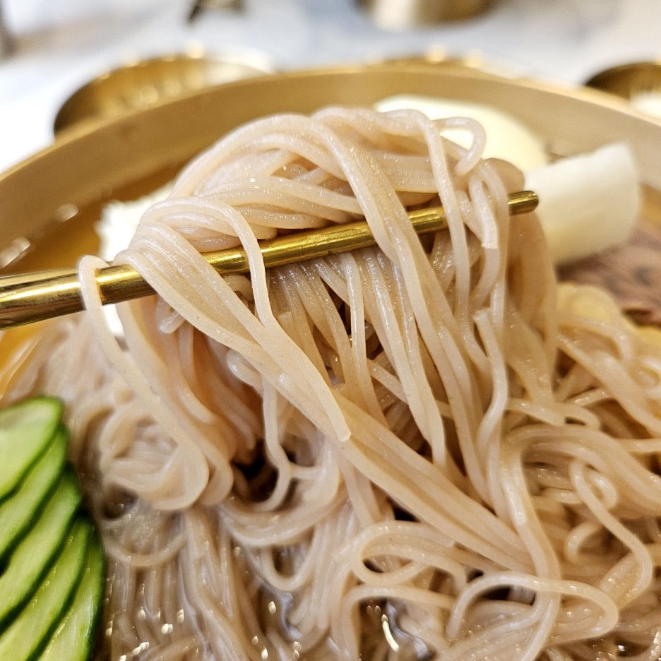 메밀 함량 80%의 면, 소 / 돼지 / 닭 / 백김치의 고명이 올라가서, 조금 더 비싼 가격으로 판매가 되어 있는 평양냉면이다.