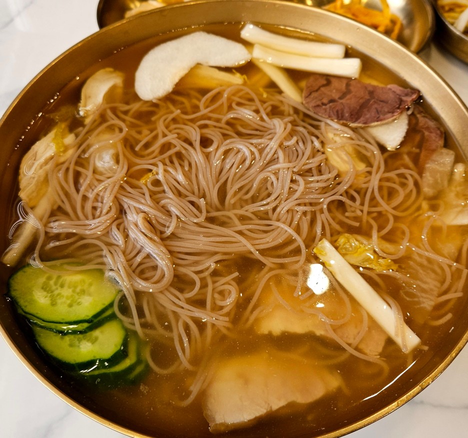 국물은 상당히 맑다. 살짝 검은빛을 띄는 것이 간장을 사용하지 않았을까 싶은 모습. 압구정의 강서면옥이 생각나는 색상이다.