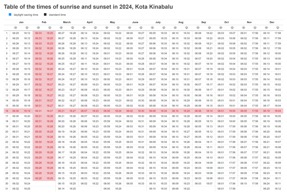 2024년 1월 1일부터 12월 31일까지 과학적으로 사전 계산된 코타키나발루의 일몰 시간표이다. 일출 시간도 함께 기입되어 있으니, 참고하시기 바란다. 이미지를 클릭하여 크게 보시면 상세하게 보실 수 있다.