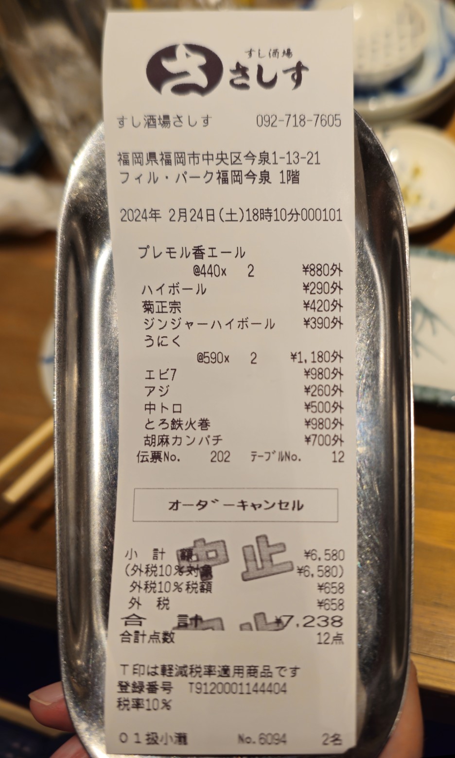 두 명이서 1시간 10분 동안 세금 포한 7,238엔, 약 6만 4천 원 정도 나왔다. 가장 비싼 시그니처 메뉴들을 많이 먹어서 아무래도 가격이 아주 저렴하지는 않았다.
