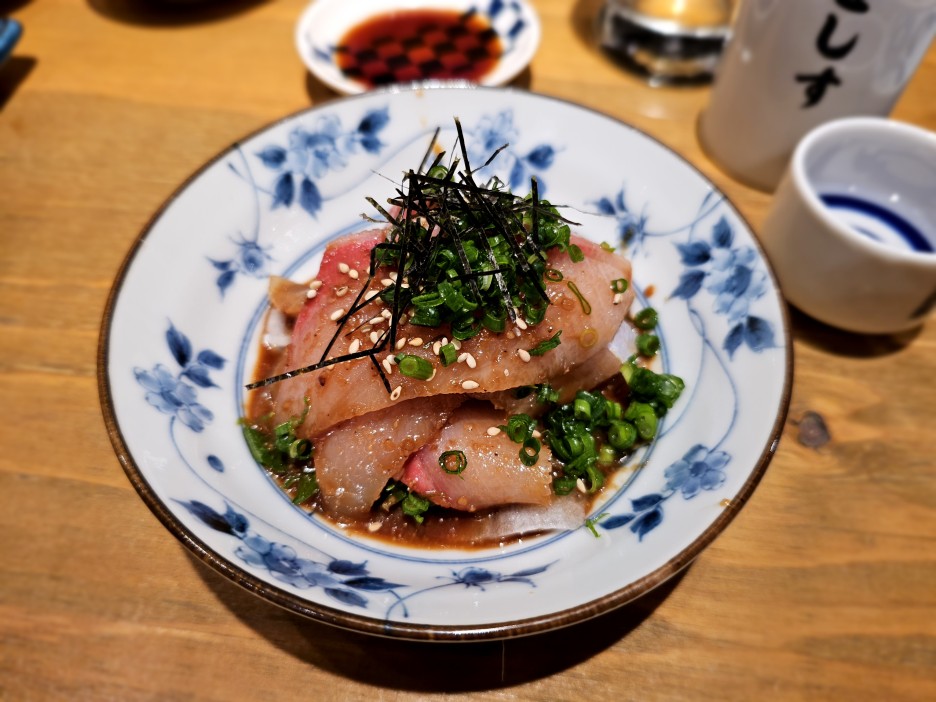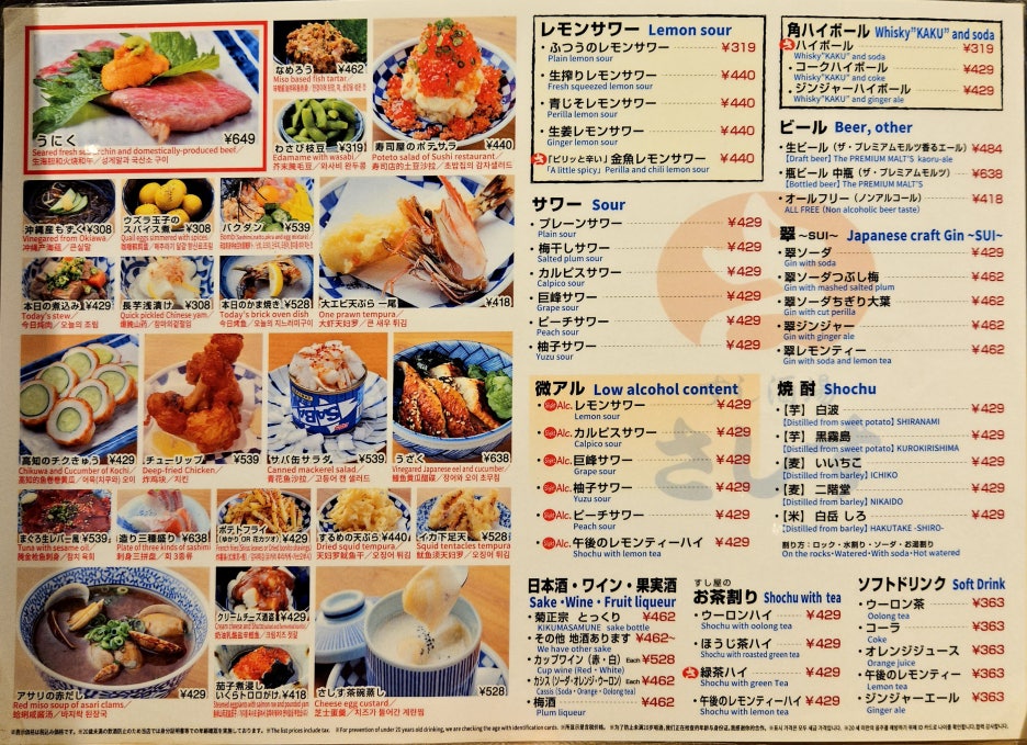 참깨 소스로 양념을 한 고등어 회인 고마사바가 후쿠오카 명물인데, 고등어가 비싸서 그런지 여기에는 참깨 양념 잿방어와 참깨 양념 방어가 있었다. 그 이외에 오늘의 모둠 회, 방어 회, 네기도로군함, 오늘의 졸임, 참치 카츠, 복어 가라아게 등이 보인다.