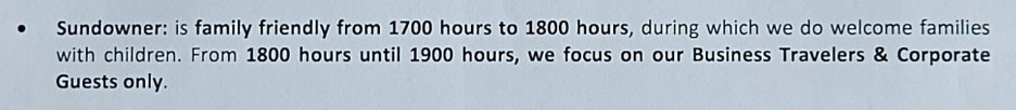 5시부터 6시까지는 가족들을 위한 시간으로 어린이들도 동반 가능하다. 6시부터 7시까지는 조금 비즈니스적인 분위기를 지향한다고 한다.