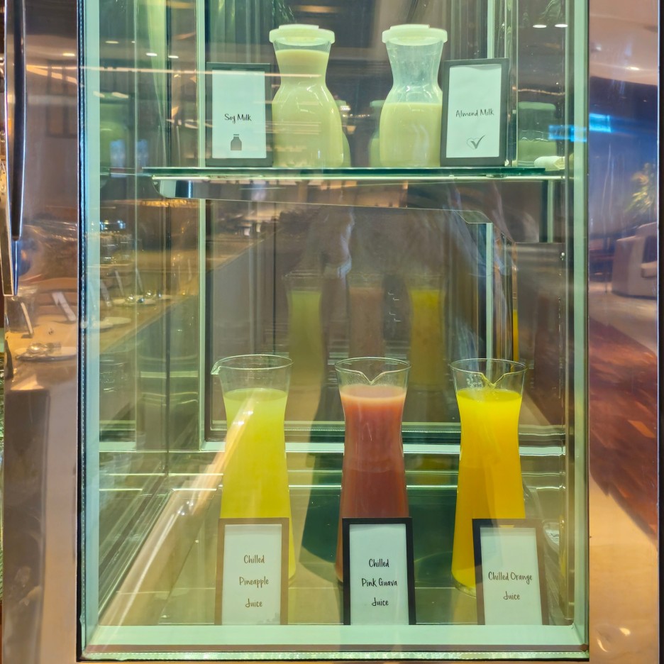 커피와 티류도 직접 마실 수 있고, 오렌지 구아바 파이애플 주스, 그리고, 두유와 아몬드 밀크.