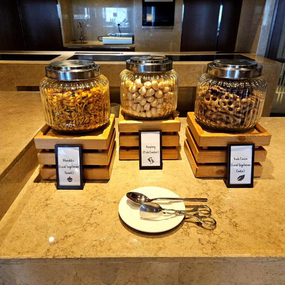 무룩쿠, 쿠이친친 등 로컬 과자와 두 가지 쿠키들이 비치되어 있다. 아주 세련된 느낌.