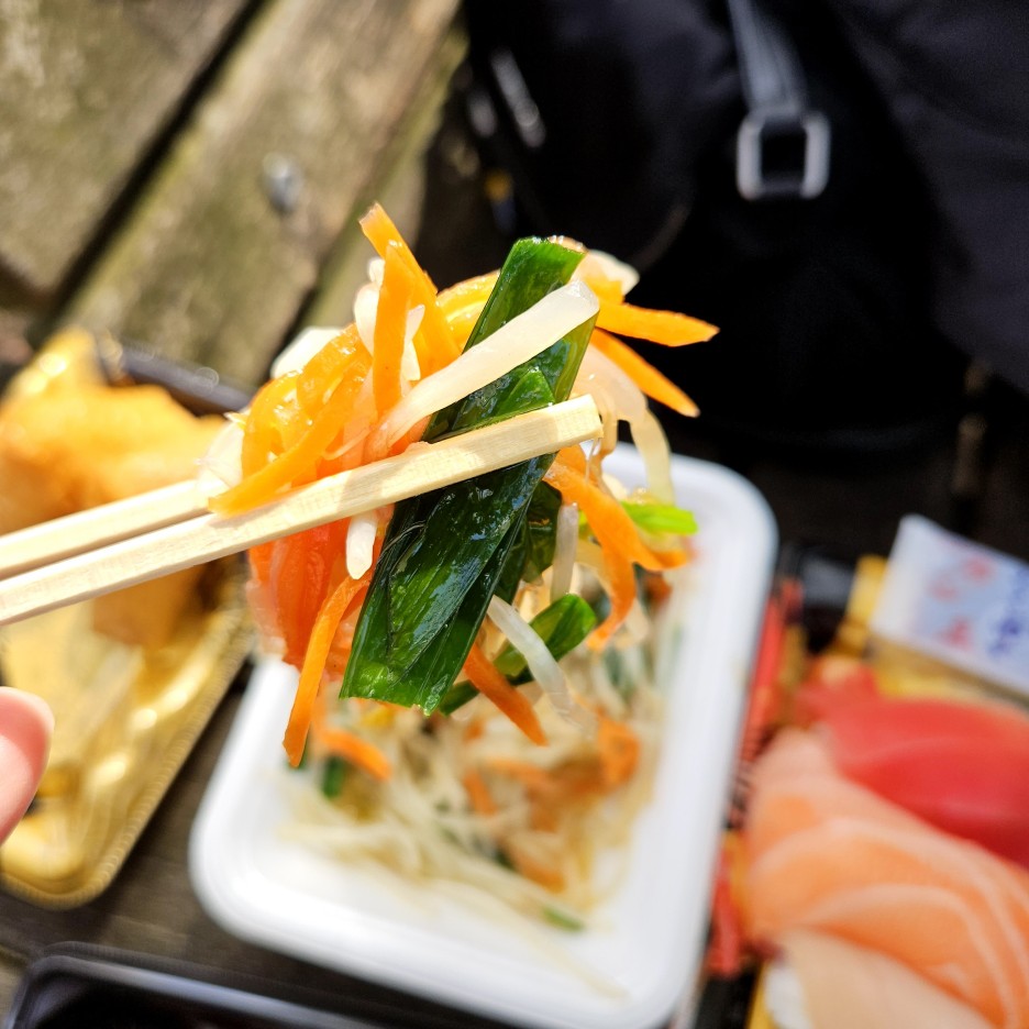한쪽 벤치에서 음식을 펼쳐본다. 우리 말고도 몇몇 일본인들도 도시락을 구매해서 벤치에서 먹고 있었다.
