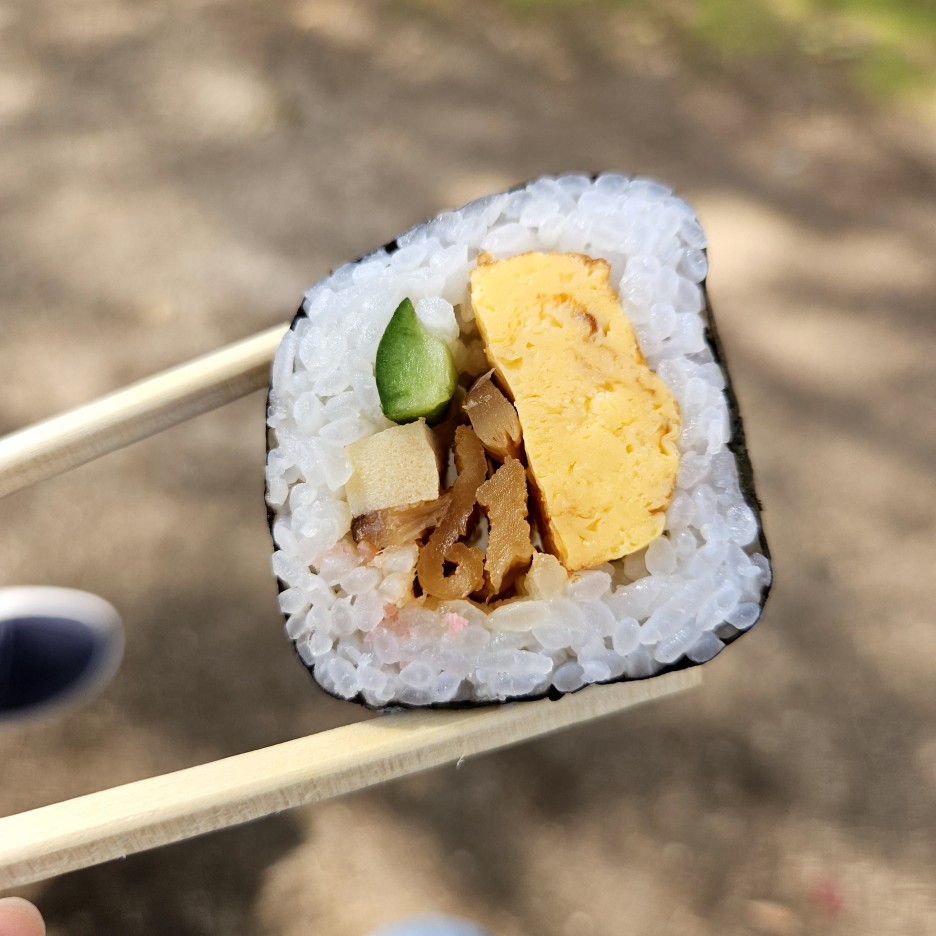 김밥은 딱 일본식으로 만들어져 한입 먹기에 아주 적절했다. 달걀말이가 달달한 맛을 책임지고, 우엉과 오이가 짠맛을 내면서 밸런스가 좋은 탄수화물.
