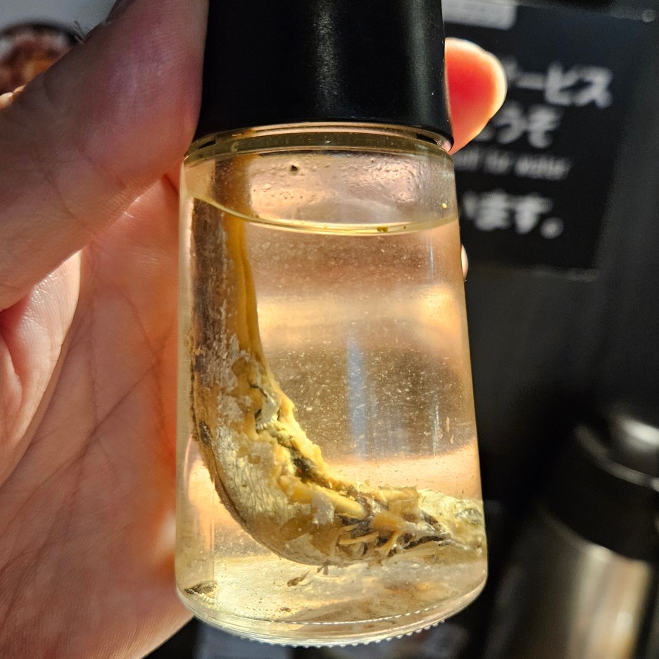 두 번째 변주는, 말린 멸치가 들어가 있는 식초를 뿌려본다. 면에 뿌려도 좋고, 수프에 뿌려도 좋다.