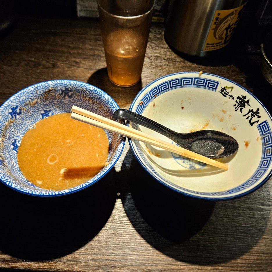 이렇게 테이블에 비치되어 있고, 무제한으로 넣어 먹을 수 있어, 굳이 50엔이라는 돈을 더 주고 매운 츠케멘을 사 먹을 필요가 있나 싶다. 물론 돈을 더 받는다는 것은 맛이 조금 다를 수 있다는 뜻이기도 할 듯.
