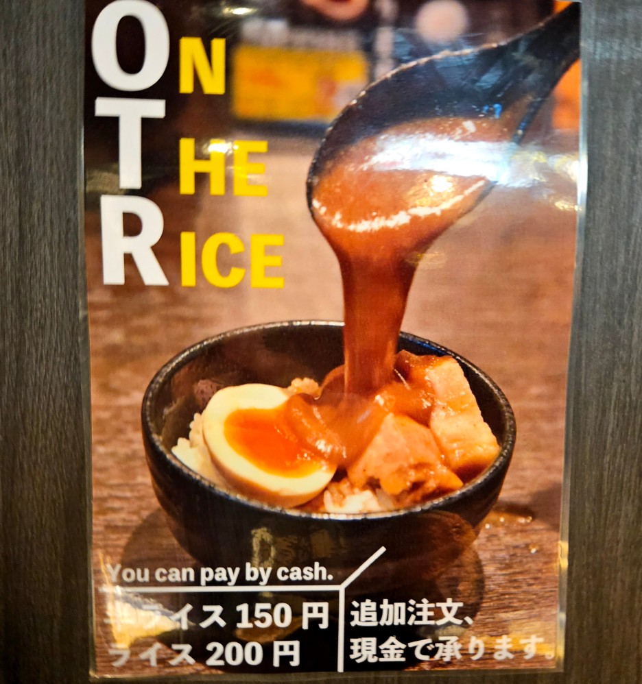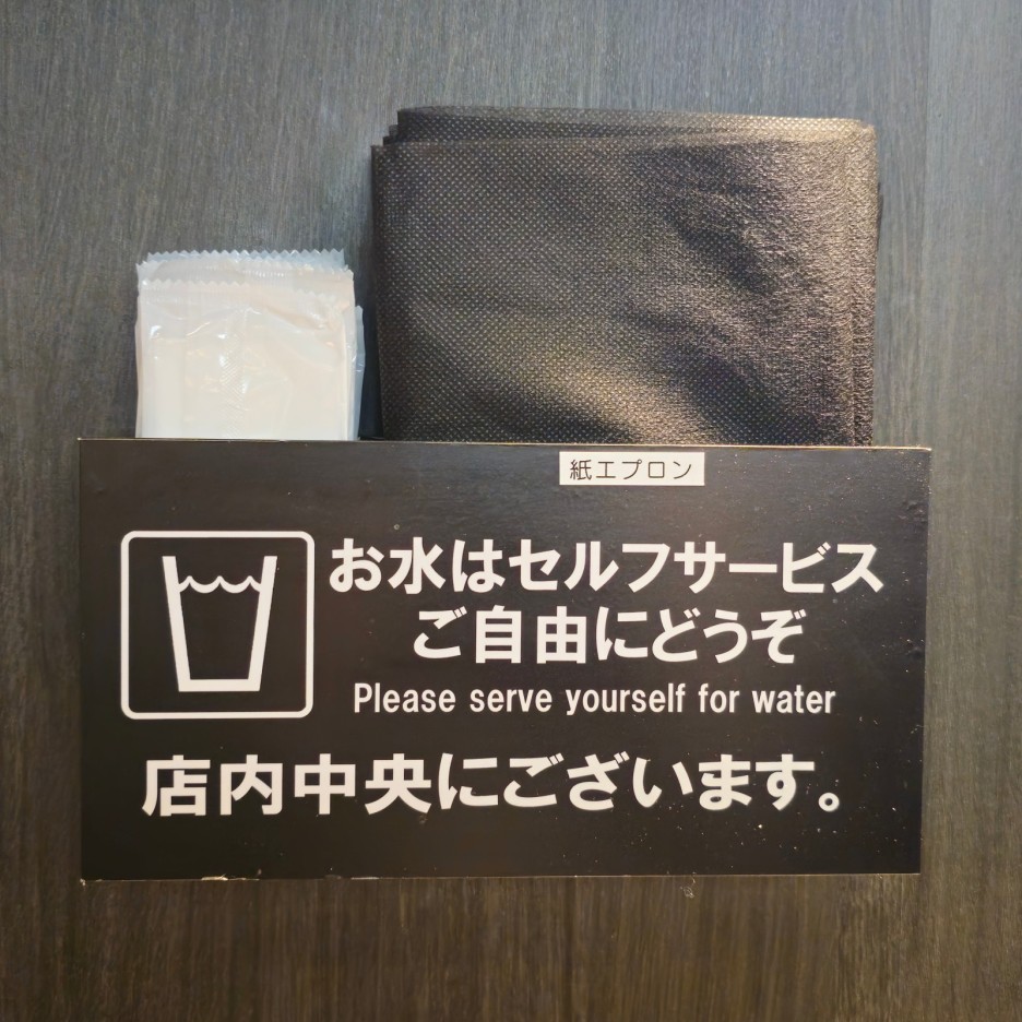 자리에는 종이 앞치마가 있고, 물은 셀프서비스라고 한다. 옆에는 추가로 주문할 수 있는 밥류들이 안내되어 있다. 물론, 맨 처음 키오스크에서 구매를 해도 되는데, 까먹으신 분들은 따로 추가 주문이 가능하다. 이때는 현금만 가능.