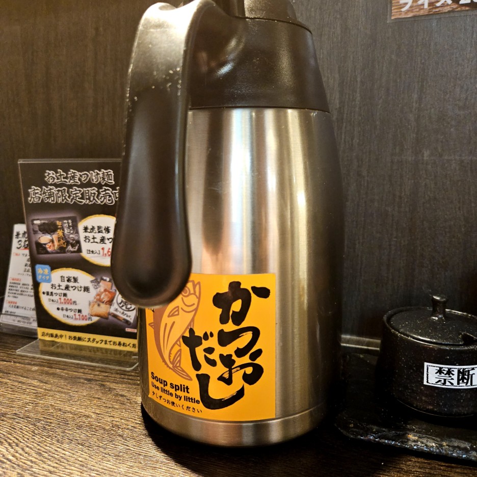 가츠오 다시가 들어가 있는 보온병. 츠케멘 수프가 짜다면 이것을 부어 먹으면 된다. 또한, 츠케멘 면을 다 먹고 수프를 마시기 좋은 염도로 낮춰서 마시게 해주는 용도로도 사용된다.
