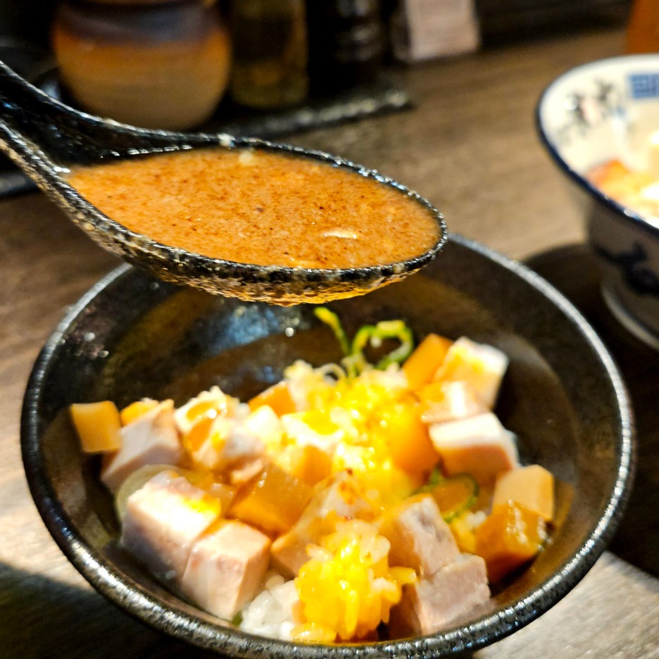 돼지고기밥 위로 츠케멘 수프를 한 숟가락 투하.