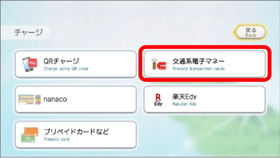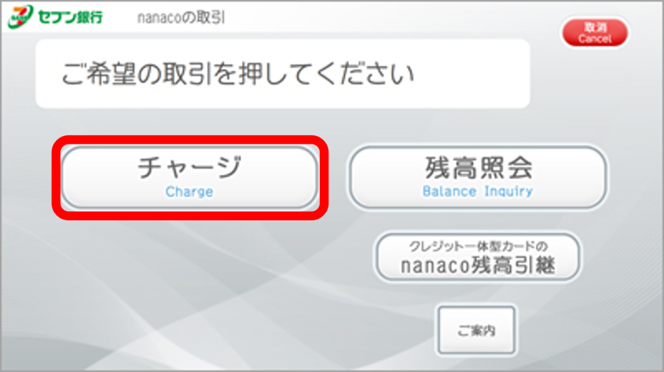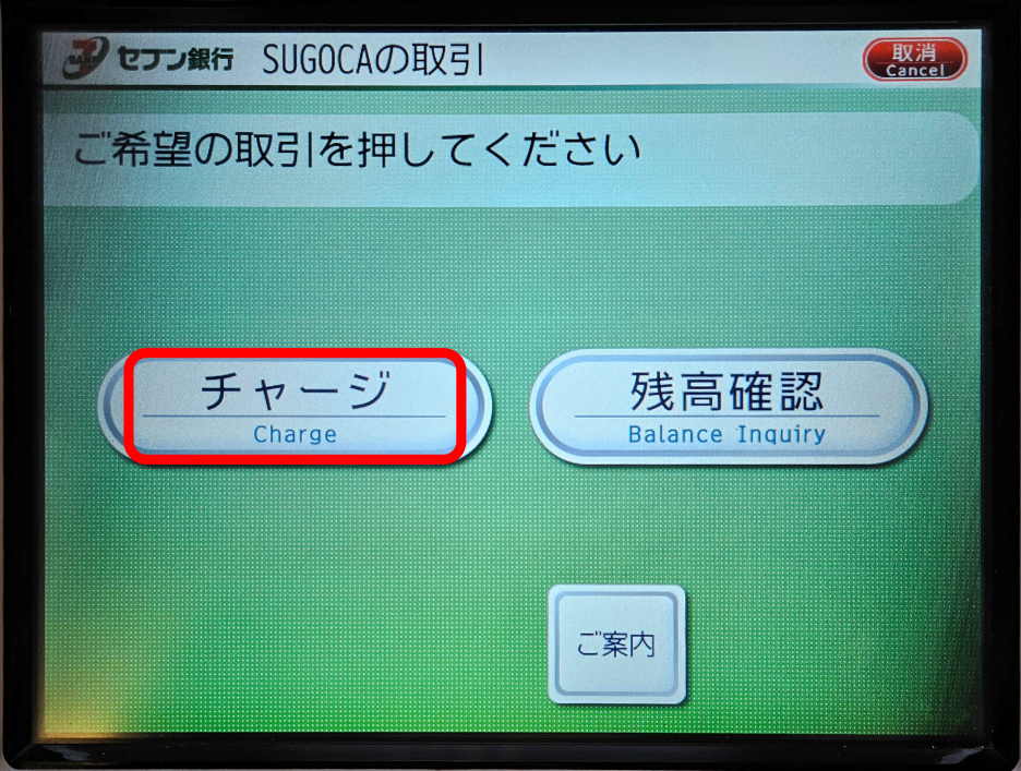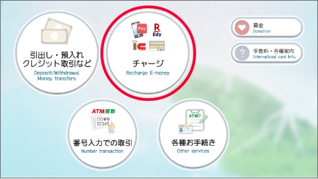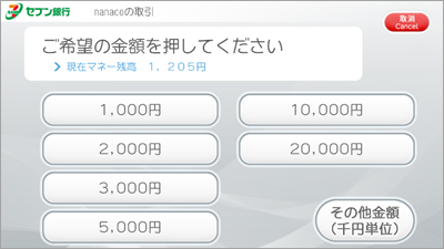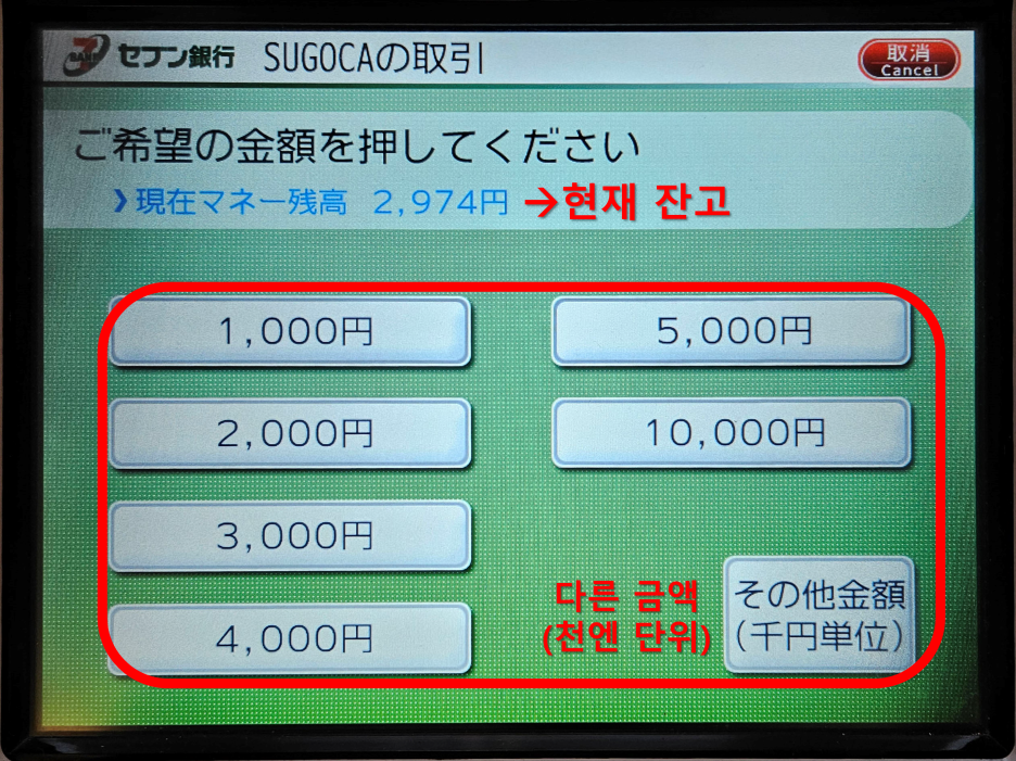 표시된 금액 이외의 다른 금액으로 충전하려면, 오른쪽 아래의 일본어와 한자가 적힌 버튼을 누른다.