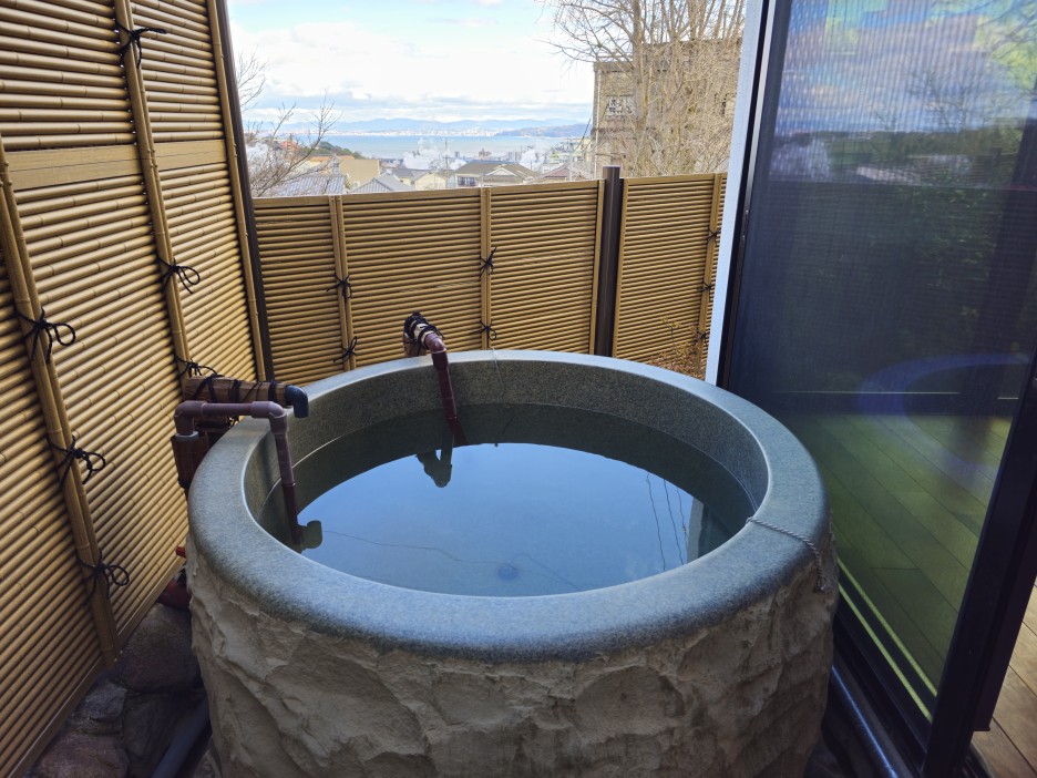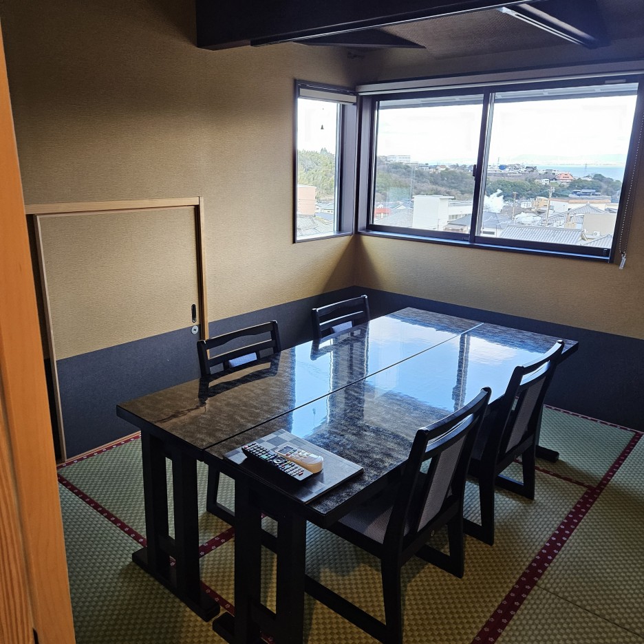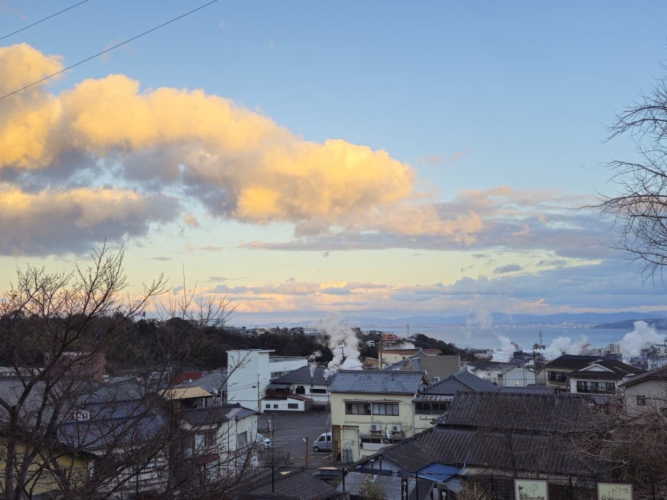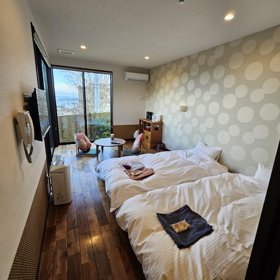 탁 트인 느낌으로 배치된 창구조로 온천수 연기가 모락모락 올라오는 벳부의 풍경을 볼 수 있다.
