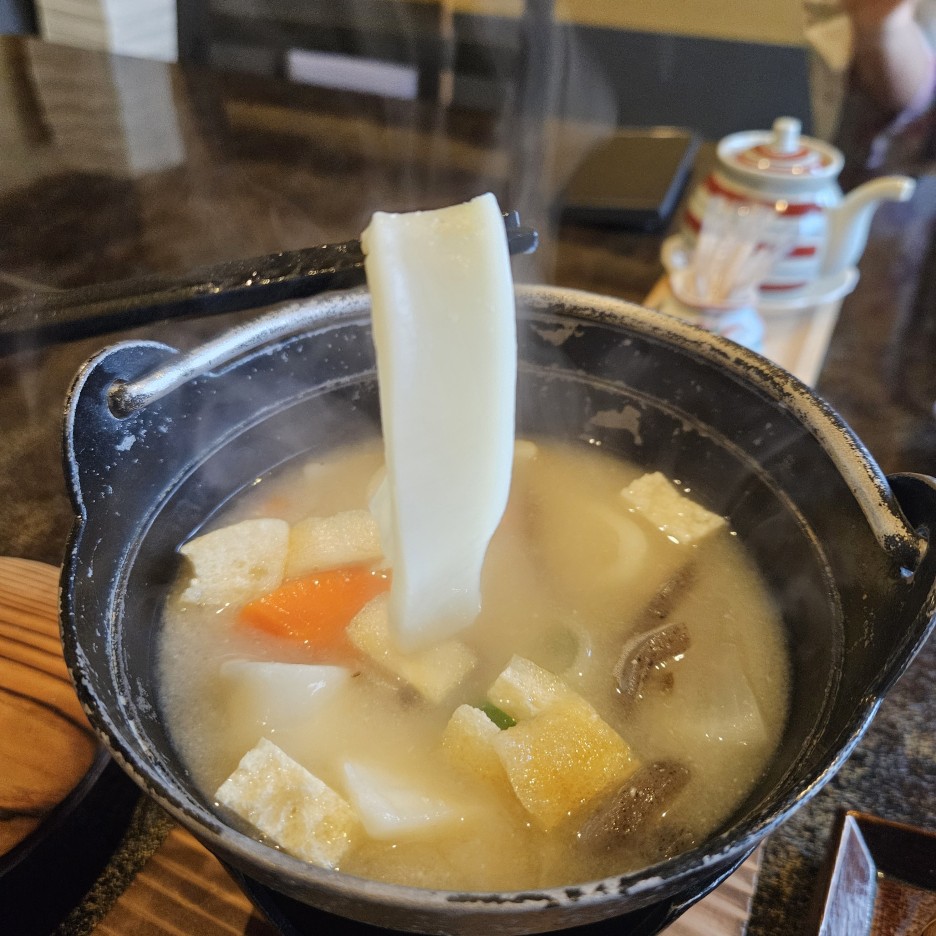 또 하나의 벳부의 명물인 당고지루. 밀가루로 만든 납작한 면으로 만든 당고를 된장과 함께 끓인 국물 음식이다.