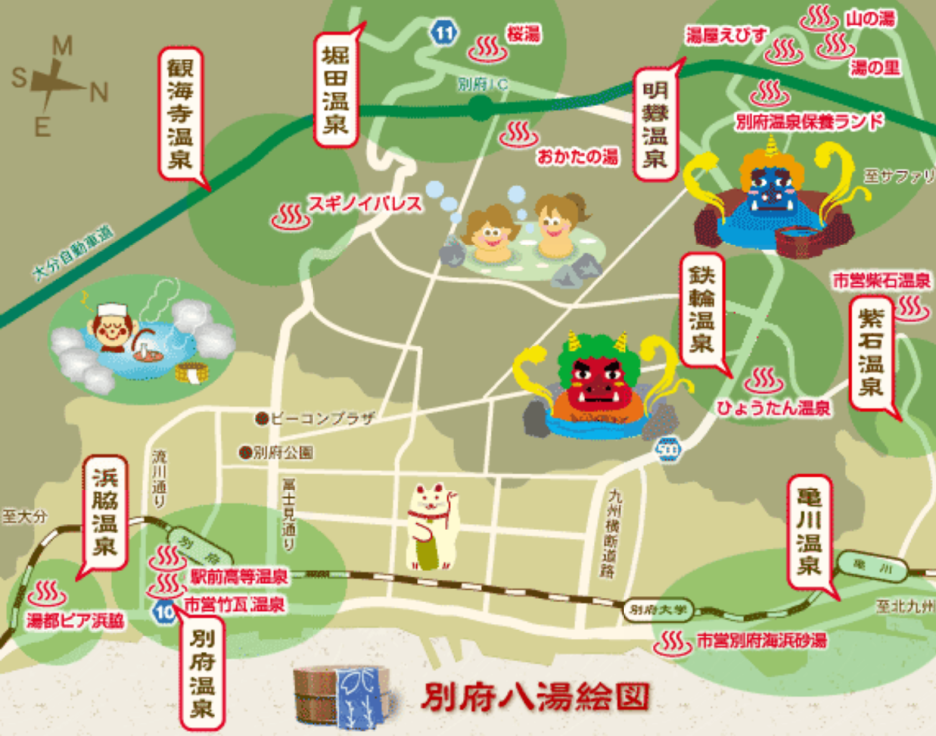 JR 벳푸역을 중심으로 한 번화가에 위치한 온천 마을. 벳푸 온천의 대표격인 '다케가와라 온천' 외에도 공동탕이 곳곳에 있다.