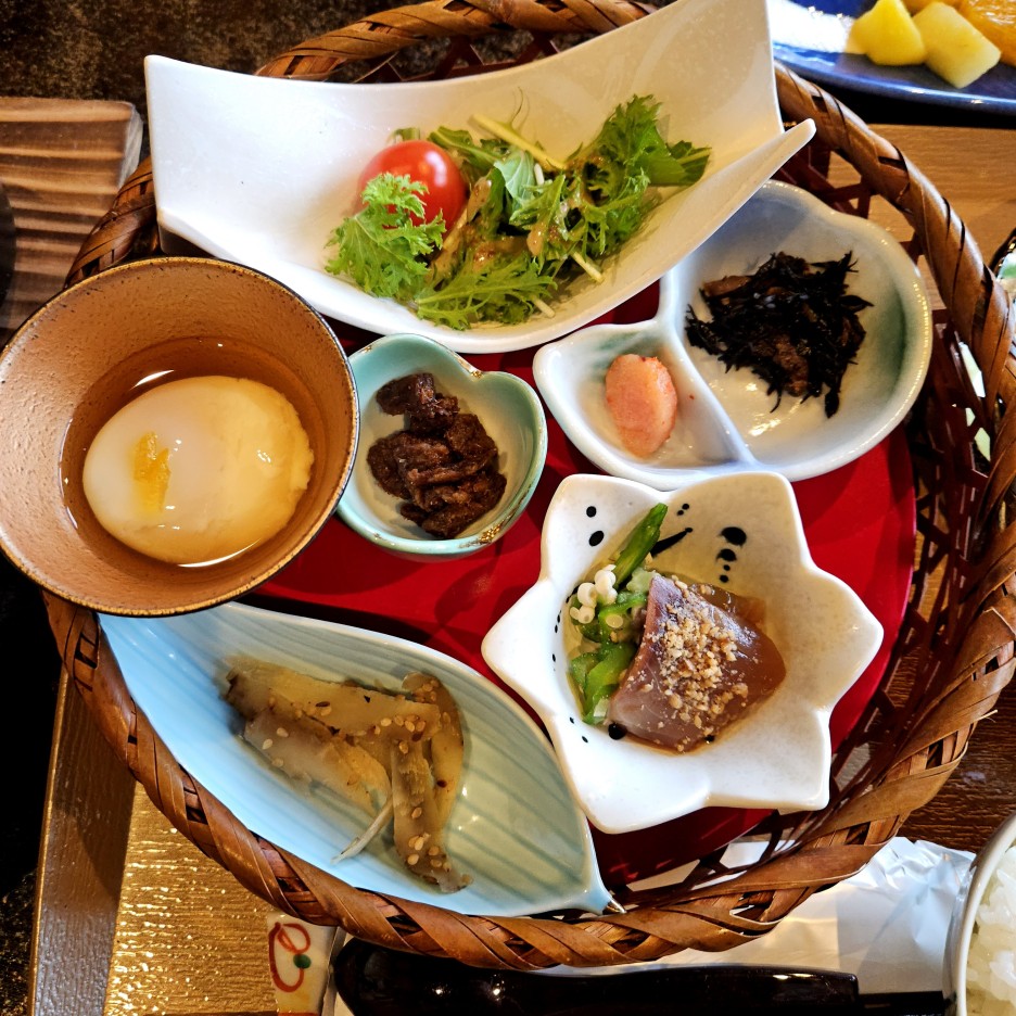 온센다마고를 비롯하여 각종 츠케모노와 고마사바 뿐만 아니라 다양한 반찬들.