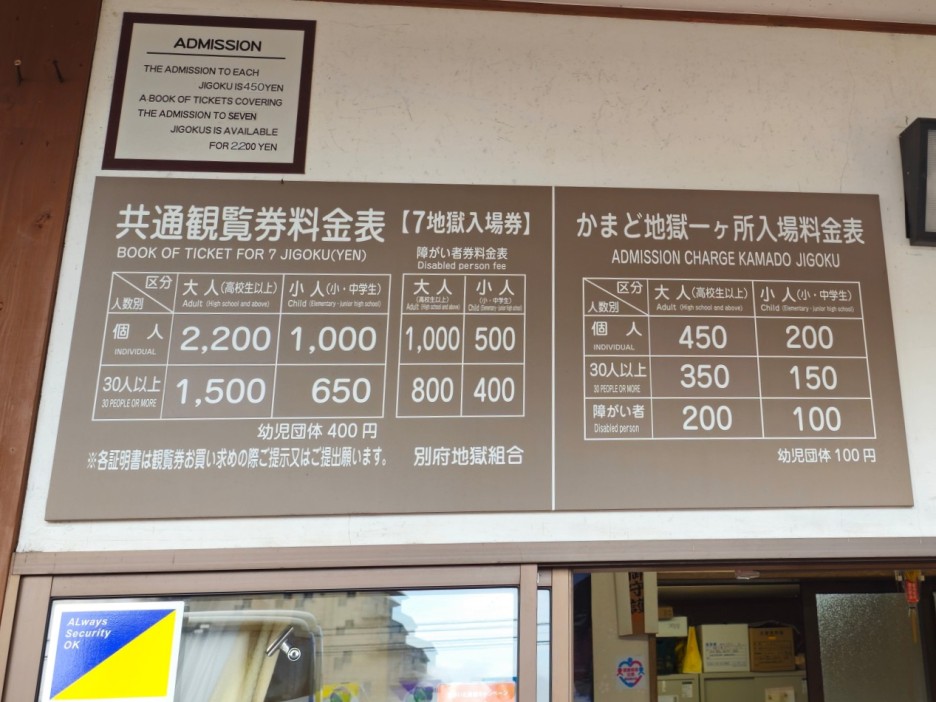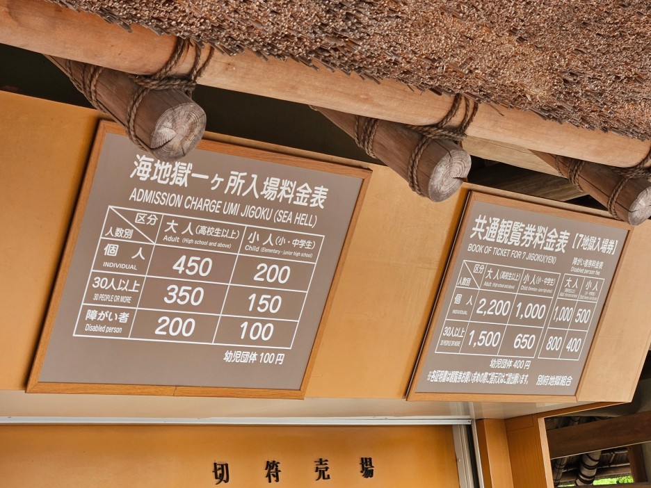 각 지옥의 입장료는 450엔이며, 이 7곳을 한꺼번에 방문할 수 있는 티켓을 2,200엔에 판매하고 있다.