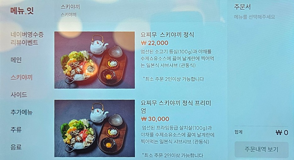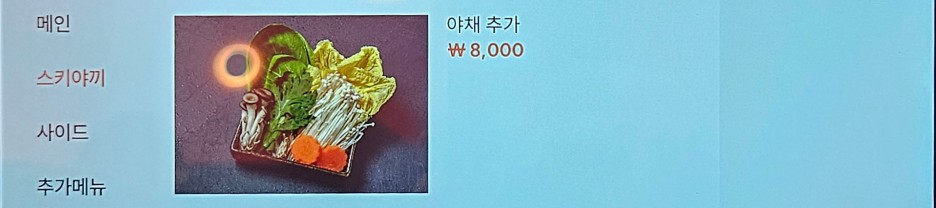 메인인 스키야키는 국물이 많은 형태인 관동식이라고 되어 있어,