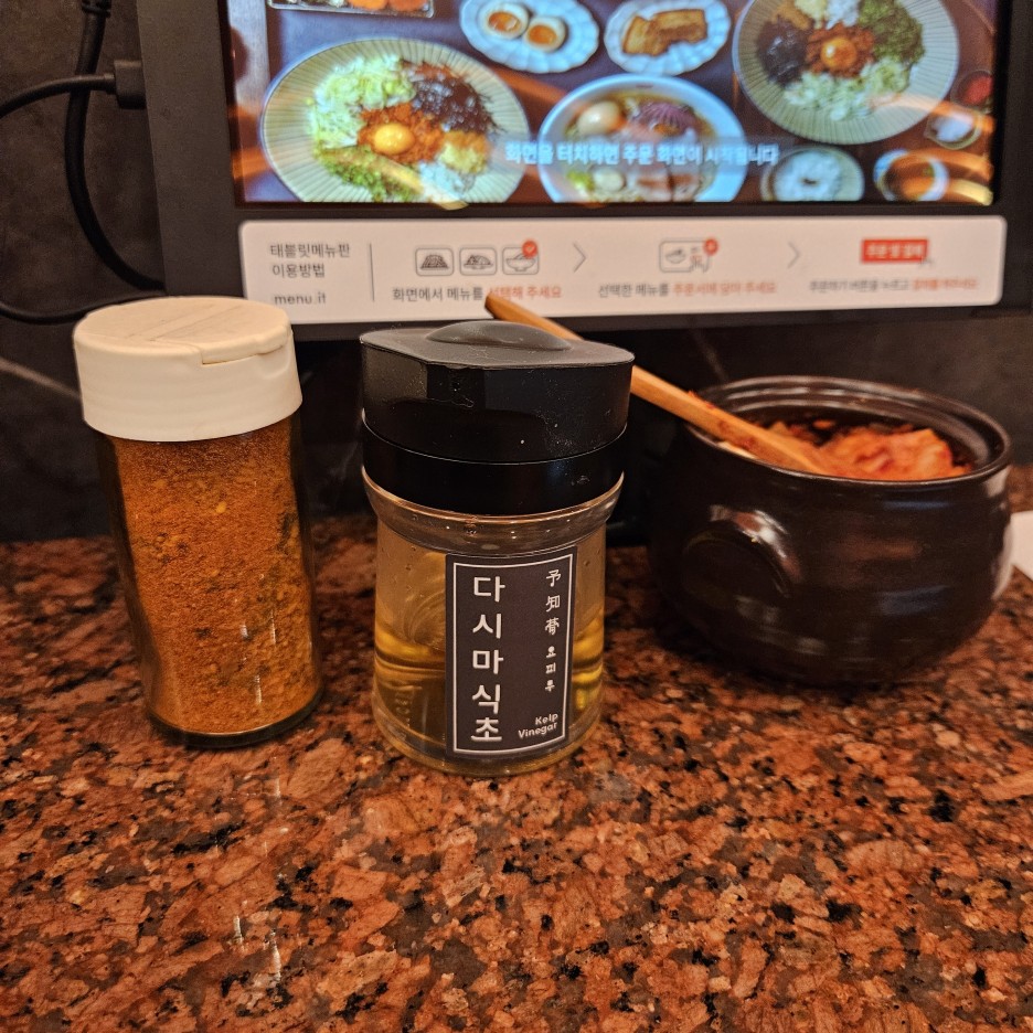 테이블에는 시치미, 다시마 식초, 김치가 구비되어 있다. 마제소바에 빠질 수 없는 다시마식초가 있다는 건 좋다.